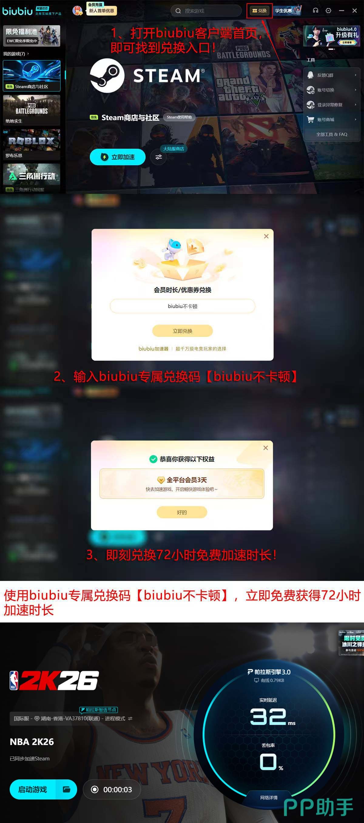 对于《NBA 2K26》玩家而言,biubiu加速器能显著提升输入响应精度与画面同步率,尤其在快速突破、投篮时机判定、防守协防预判等依赖帧率稳定性的操作环节表现突出。当前新用户可免费体验完整功能:注册即赠24小时加速时长;在首页“兑换”栏输入专属口令【biubiu不卡顿】,额外获取72小时权限,两项权益叠加总计可达96小时试用期。