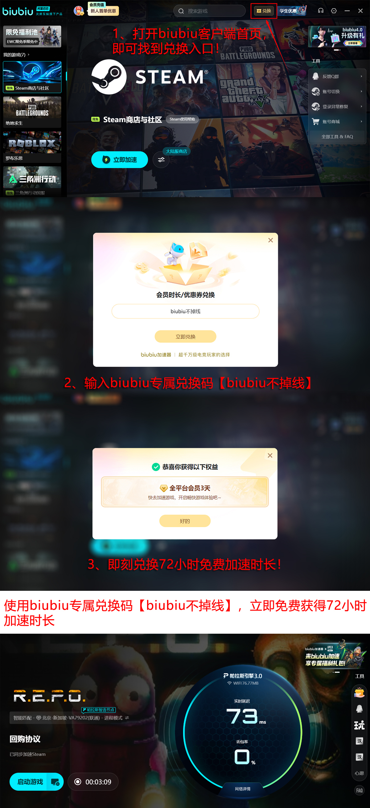 新用户注册即可获赠24小时免费试用权限,输入专属激活码【biubiu不掉线】,额外获得72小时连续加速服务,累计享受四整天高速网络体验。该权益可有效提升声纹定位精度、降低物品拾取延迟,在应对“猎手”类怪物的声波扫描机制时,为玩家争取关键反应窗口。