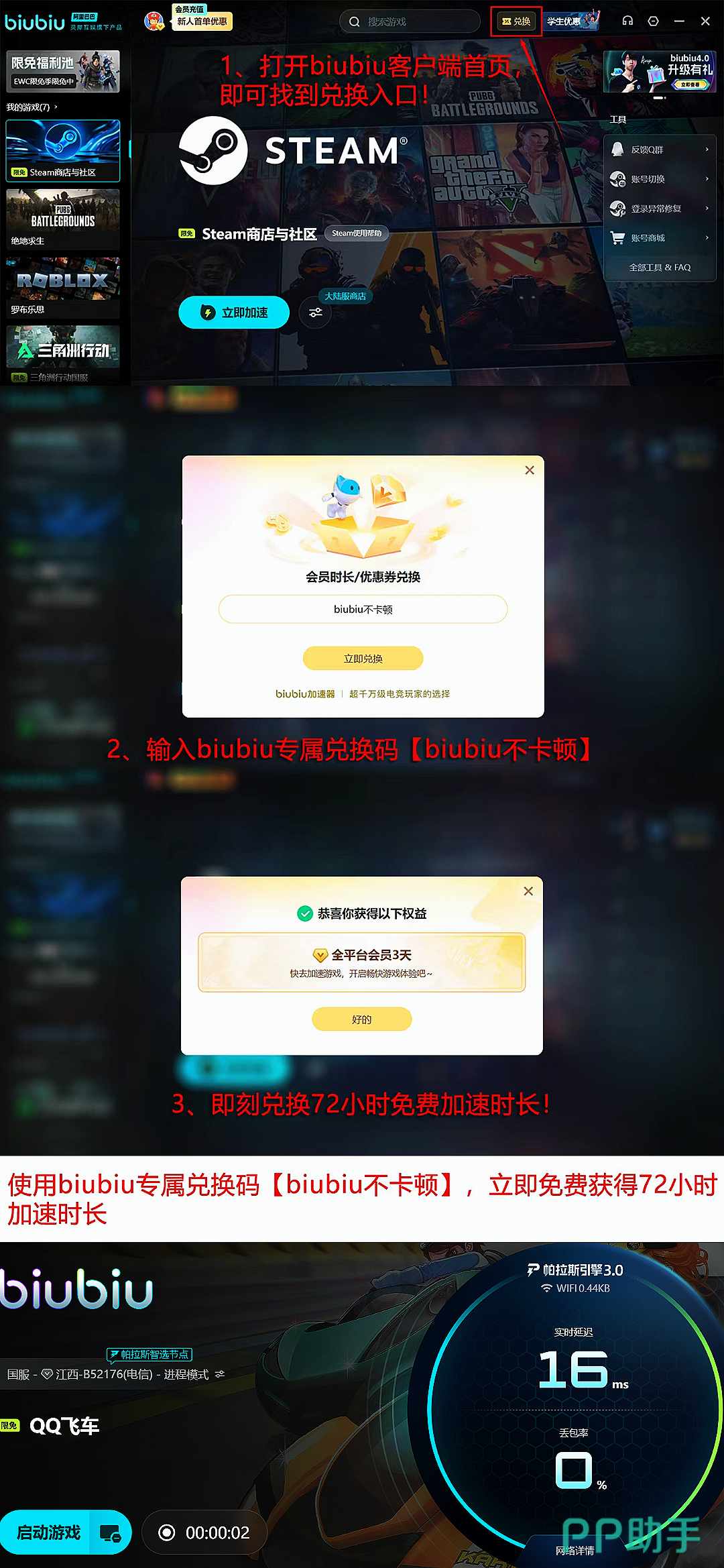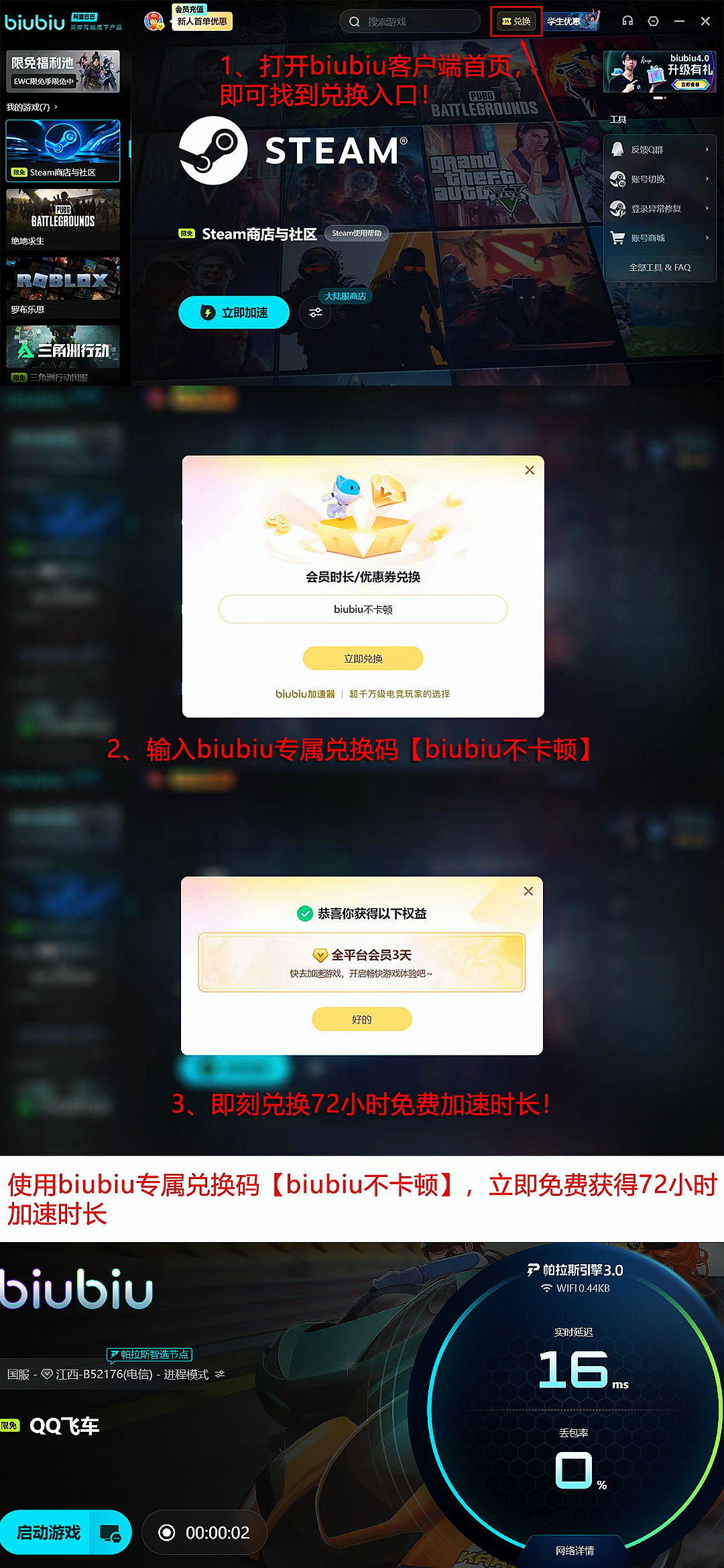 实测数据显示,启用biubiu加速器后,国际服用户平均延迟下降率达62%,丢包率趋近于零。新用户完成注册即可解锁24小时全游戏通用加速权益;所有用户输入兑换码【biubiu不卡顿】,还可额外领取72小时专属加速时长,覆盖QQ飞车全服段加速需求。