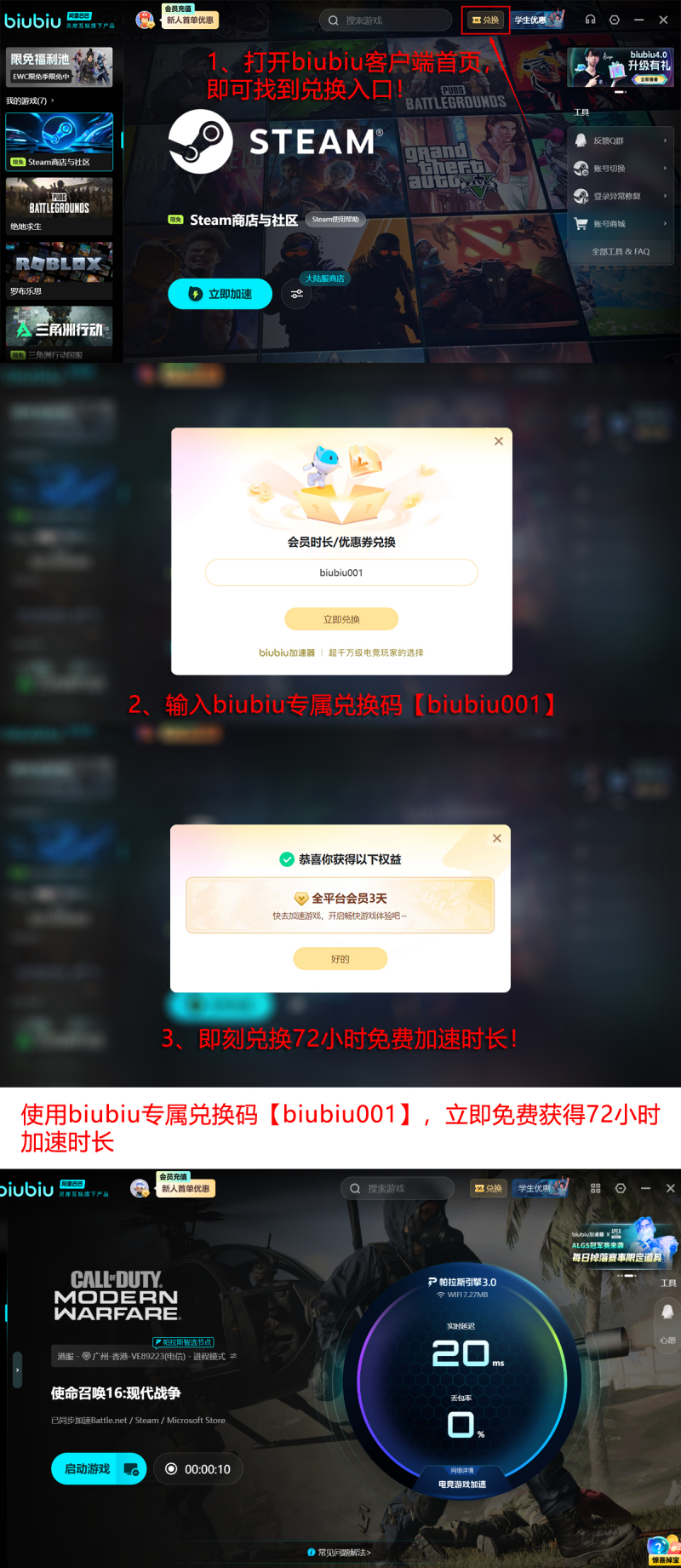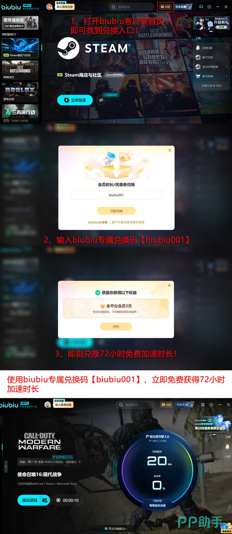 现面向新用户提供双重福利:首次注册可获赠24小时全功能试用权限;在加速器内兑换中心输入专属口令【biubiu001】,即可额外激活三天高级服务,两项权益叠加后总计达96小时免费使用时长。所有流程无需手动配置节点或修改系统参数,搜索“使命召唤:现代战争2”后点击一键加速即可生效。目前,该加速方案已被职业赛事体系采纳——pero官方指定为赛事保障工具,同时获得PUBG职业选手小叮当公开推荐。九游、交易猫、biubiu加速器均为阿里巴巴灵犀互娱旗下产品APP。