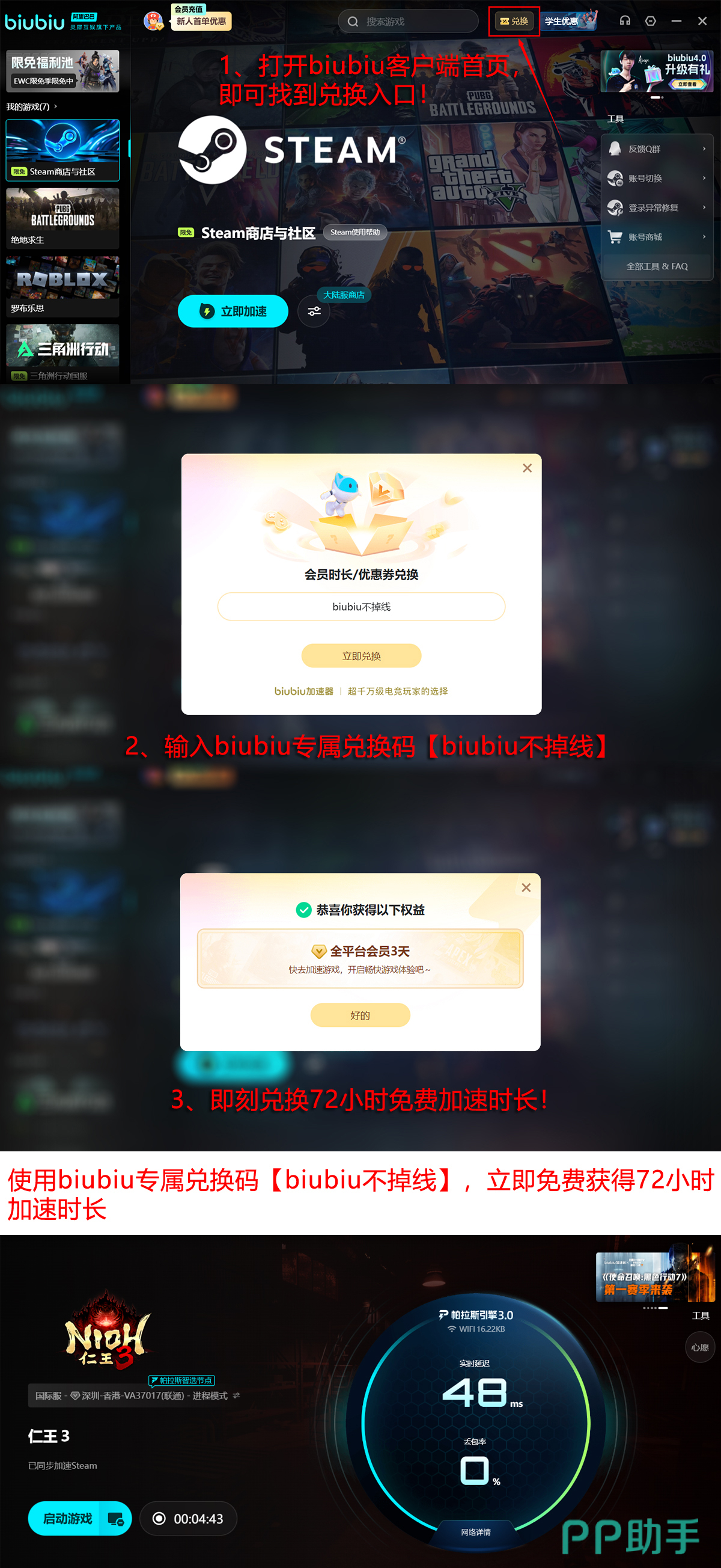 当前正值限时福利期(1月29日至2月13日),biubiu加速器面向《仁王3》玩家开放专属免费加速通道。新用户完成注册后即可领取首日24小时全功能试用权限;输入激活码【biubiu不掉线】,还可额外获得连续72小时加速服务,总计享96小时无限制加速体验。综合来看,硬件升级、画质策略调整与网络专项优化三者协同,辅以biubiu加速器提供的稳定低延迟通路,构成当前环境下最具性价比的《仁王3》性能提升方案。即刻部署,告别加载等待,让每一次拔刀都无缝衔接。