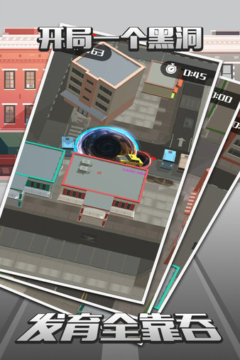 游戏以宇宙级黑洞为初始形态设定,采用写实风格城市地图,建筑密度高、结构细节丰富。吞噬对象涵盖路灯、车辆、商铺至摩天大楼等全尺度人造设施,单位体积换算体型增益比例明确,大型目标提供更高成长效率。PVP对抗中支持策略性操作,如预判位移、引力牵引干扰等技巧,实现低等级黑洞对高等级目标的逆向压制。