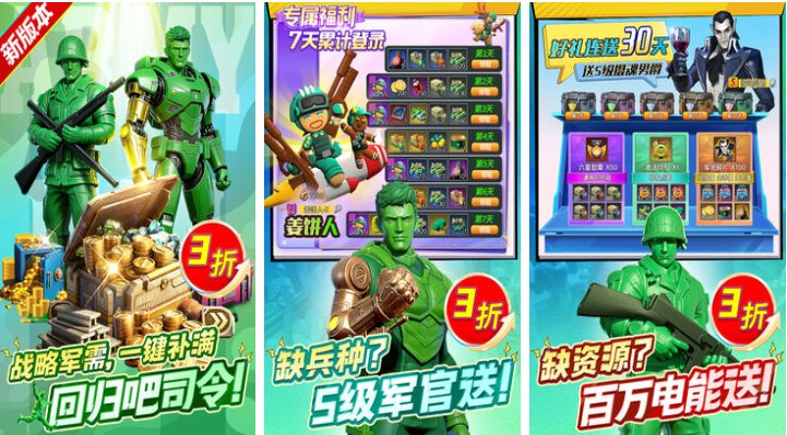 以经典兵人玩具为原型的3D策略战争手游,采用上帝视角布阵指挥。玩家可自由收集并培养不同兵种,涵盖步兵、装甲、支援与特种单位,各具独特技能与克制关系。资源采集、基地建设、科技研发构成完整PVE成长体系;实时匹配PVP则考验阵容搭配与临场应变。高度还原童年摆弄兵人沙盘的体验,唤起90后群体强烈情感共鸣。