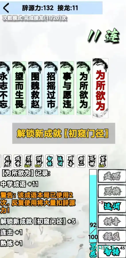 融合Roguelike元素与传统文化的创新型文字游戏。每局随机生成成语词库与特殊技能卡,玩家需在限定步数内完成接龙链路,同时应对随机事件与属性加成。单机运行,无广告干扰,支持离线查询与释义提示,词汇量覆盖中小学课标及常用典故,兼顾知识性与趣味性,适合学生拓展语感、成人巩固积累。