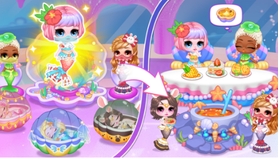 采用Q版卡通美术风格打造,构建了一个魔法感十足的海底王国。玩家可对多位个性鲜明的美人鱼公主进行外观定制,包括服饰更换、配饰添加与表情调整;同时开放城堡装扮系统,支持自由布置房间、庭院与公共区域。游戏内含多个迷你小游戏,并设有丰富海底景观,如荧光珊瑚群、沉船图书馆与水晶瀑布等视觉奇观。