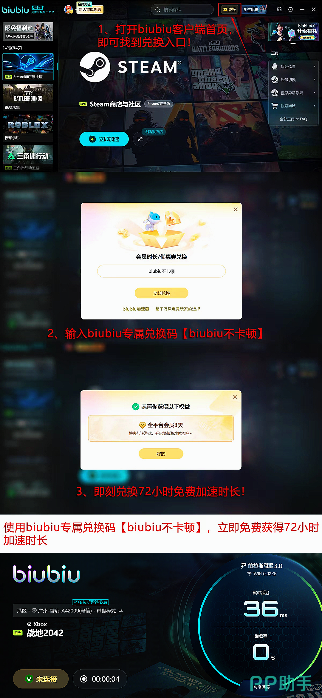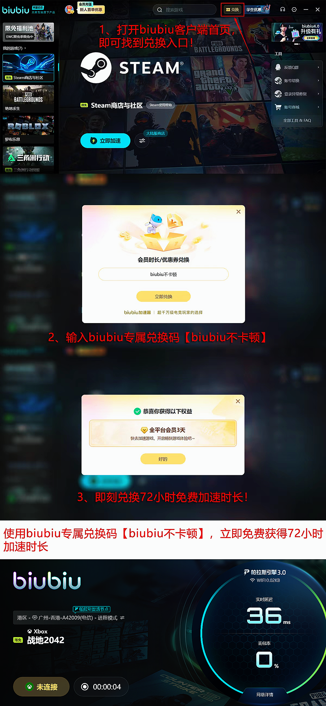 大量实测用户反馈,在启用biubiu加速器后,《战地2042》的连接稳定性、帧率一致性及开火响应速度均有明显改善。新用户完成注册即可获赠24小时全游戏通用免费加速权益;输入专属兑换码【biubiu不卡顿】,还可额外领取3天加速时长,总计享96小时免费服务;该福利同样面向已注册的老用户开放。