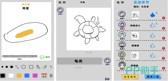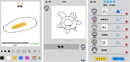 以绘画接龙为核心机制,主打轻量级创意表达。经典模式最多容纳6人轮转参与,系统随机分配题目(如“乌龟”“太阳”“滑梯”等具象物体),首位玩家依据题干绘制简笔图形,下一位玩家根据画面猜测原题并作答,依序推进直至全员完成。该流程自然引导观察力、想象力与表达准确性协同发展,适合家庭成员共同参与的语言启蒙与艺术启蒙场景。