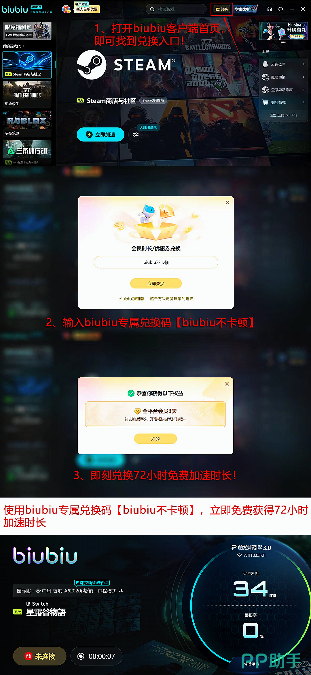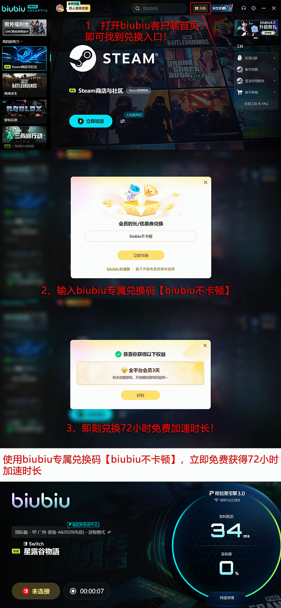 目前该工具持续迭代底层架构,在保障低延迟响应的同时,同步优化新用户服务体验:注册即赠24小时全游戏通用加速时长,支持任意节点自由切换;此外,输入兑换码【biubiu不卡顿】可额外获取3天连续加速权益,新老用户均可使用。