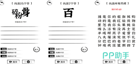 深度融合汉字构形原理与当代网络语境,每关呈现高度变形的复合字形图谱。玩家须在60秒限时内,通过滑动连线方式精准圈出隐藏于复杂笔画中的热门梗词。题目设计强调视觉辨识与文化联想双重能力,兼具知识性与趣味性。
