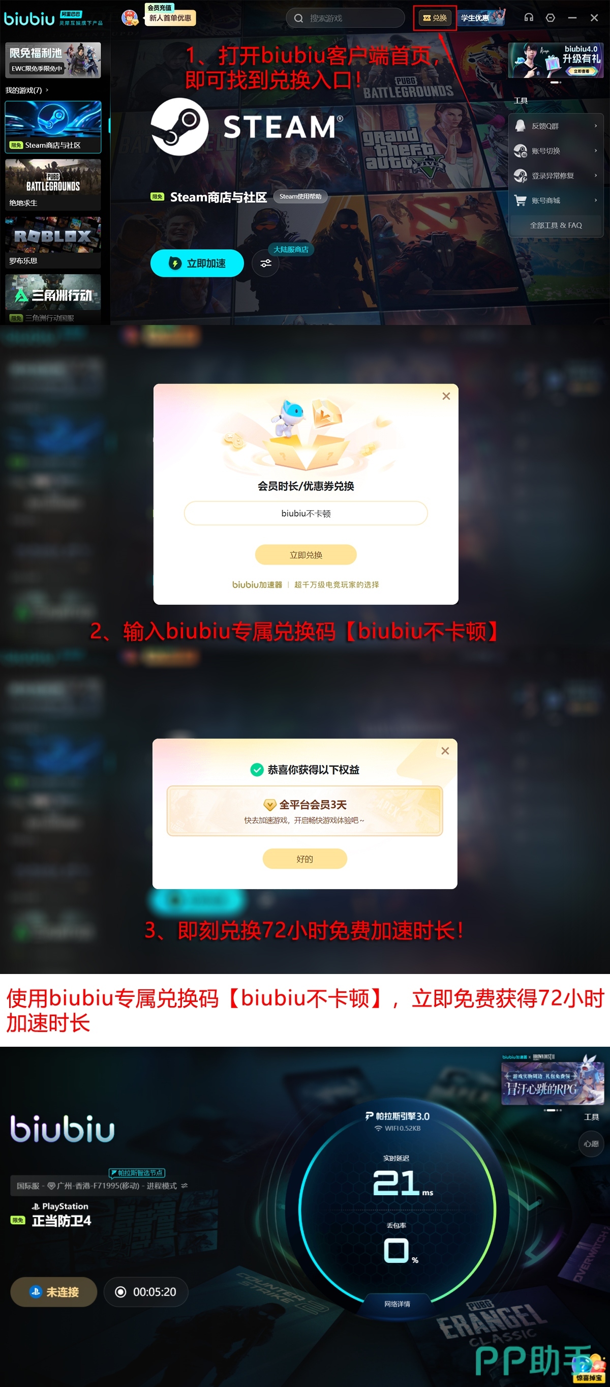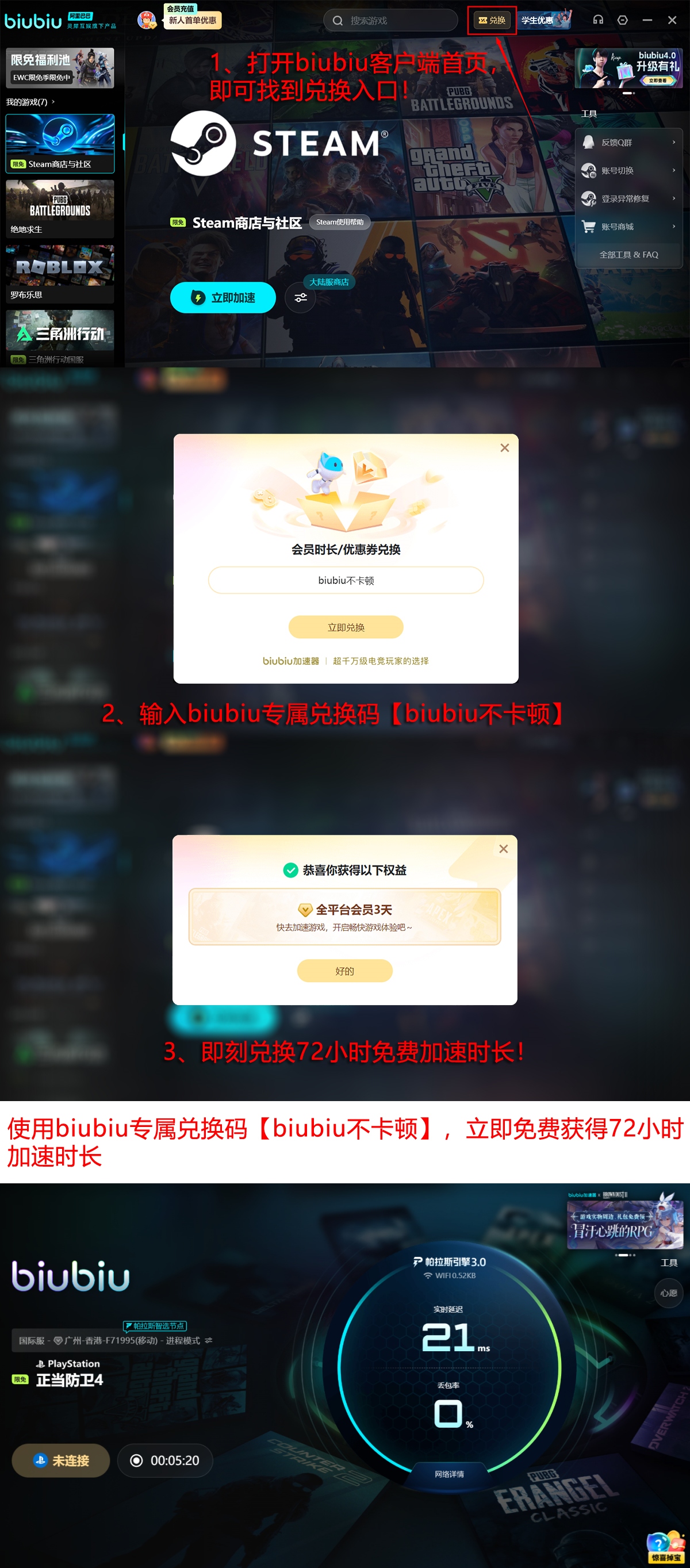 新用户注册即赠24小时全功能加速时长,无门槛启用。所有账号均可凭兑换码【biubiu不卡顿】额外领取3日加速服务。叠加后首期可享总计96小时免费试用周期,后续按需开通正式会员服务。