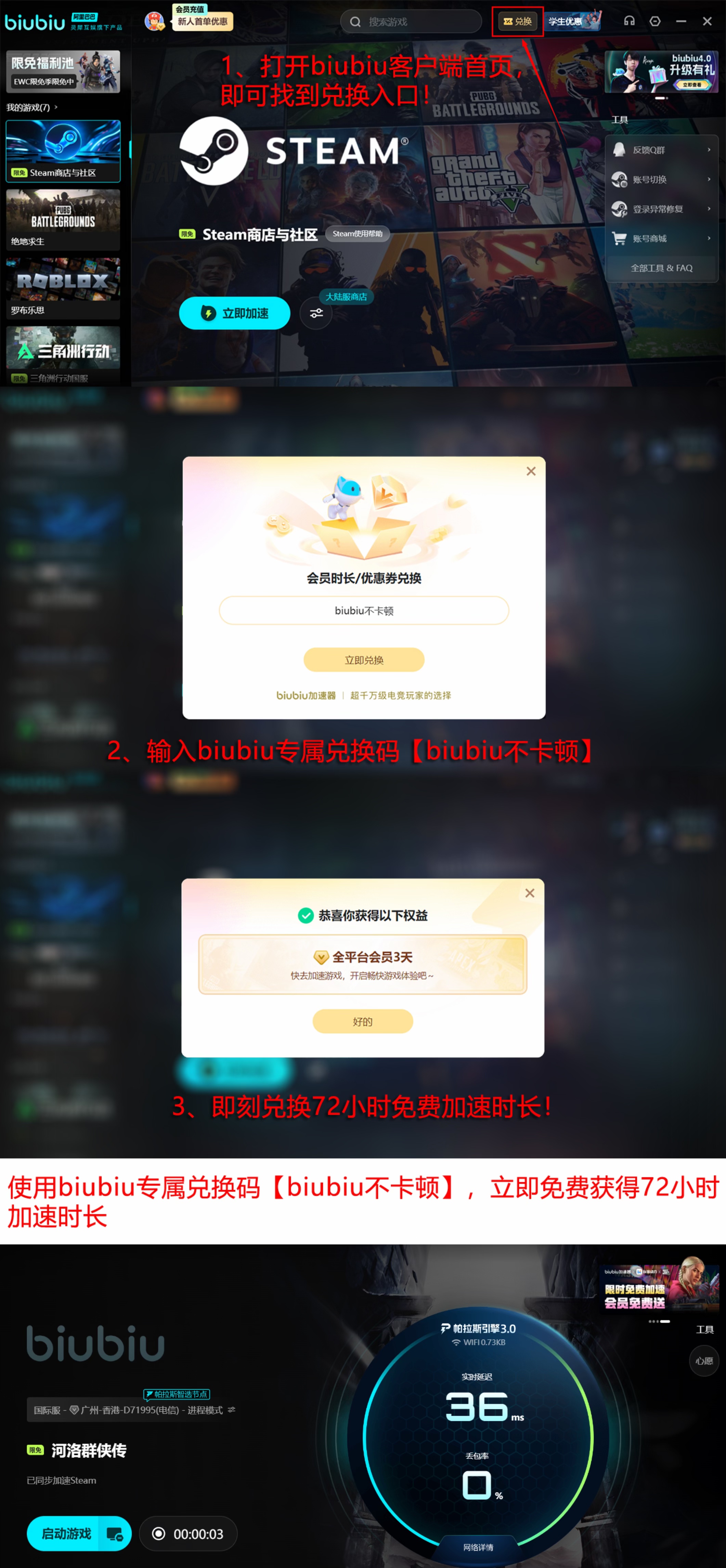 功能覆盖方面,biubiu支持Windows平台PC游戏加速,兼容主流模拟器及跨端设备(如SW2、PS5、Xbox通过远程串流方式接入后亦可启用加速服务)。安装包体积轻量,平均安装耗时控制在3分钟内。新用户注册即赠24小时免费加速时长;所有用户均可凭口令“biubiu不卡顿”领取总计72小时加速权益,覆盖《河洛群侠传》全流程约30–40小时的游戏时长,足以支撑完整通关与支线探索。
