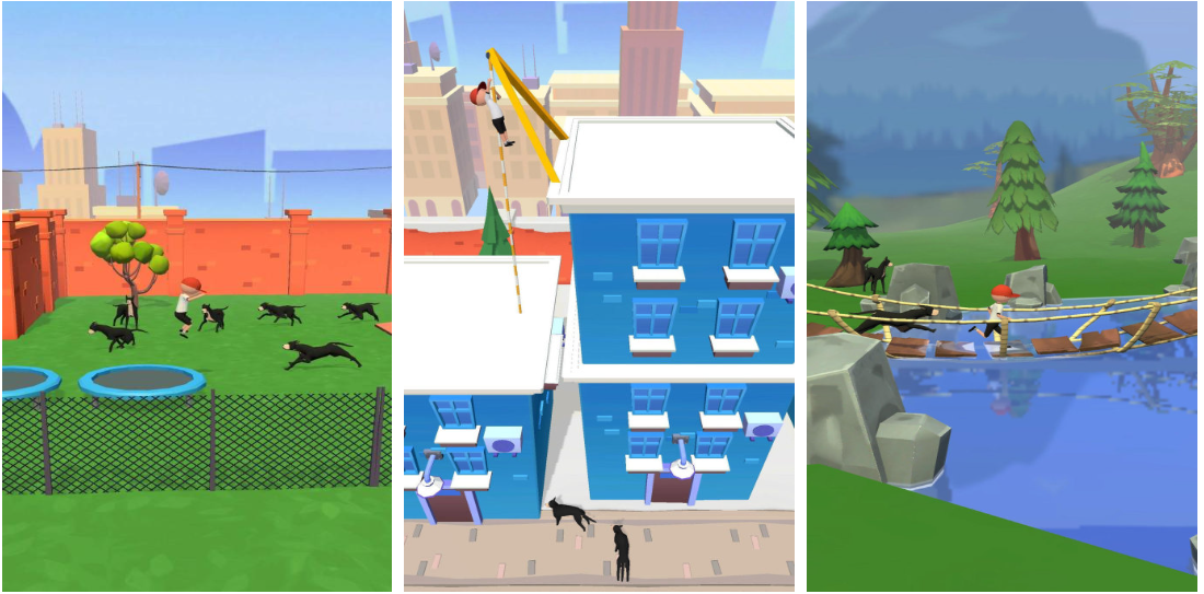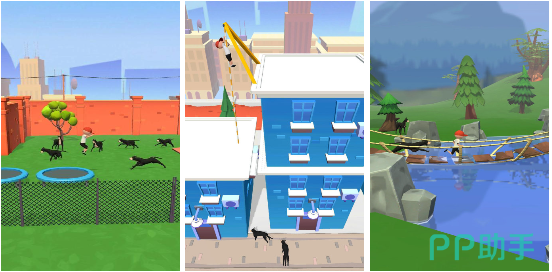 本作为快节奏跑酷逃生向作品,玩家操控人类角色在多变地形中躲避具有攻击性的拟人化恶犬追击。场景涵盖城市街道、废弃工厂、森林小径等十余种主题区域,每处均设置动态障碍与随机事件;角色移动具备滑铲、跳跃、急停等基础操作组合,配合镜头晃动与音效压迫感,强化临场紧张情绪。虽以“被追”为驱动逻辑,但画风采用柔和轮廓+夸张肢体动画,消解真实威胁感,形成反差式幽默体验。