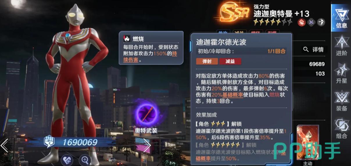 强力迪迦——燃烧流体系核心。小技能可对全体敌人施加灼烧效果,该DOT本身即具备150%群体倍率;大招专注单体爆发,确保在持续战与限时挑战中输出稳定可靠,为燃烧队提供不可替代的伤害基底。