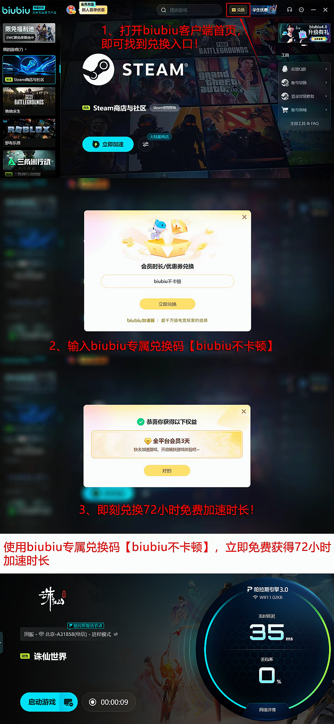 目前biubiu加速器已实现全平台网络协议深度适配,安卓端支持IPv6双栈加速,iOS端通过企业签名通道保障服务稳定性。福利政策同步升级:新用户完成手机号验证后,自动获得24小时全游戏通用加速时长;输入专属兑换码【biubiu不卡顿】,可额外领取3天加速权益。两项叠加享总计96小时免费使用权限,覆盖《诛仙世界》全部版本更新周期及大型资料片(如“九幽魔劫”“上古神兵录”)上线窗口。