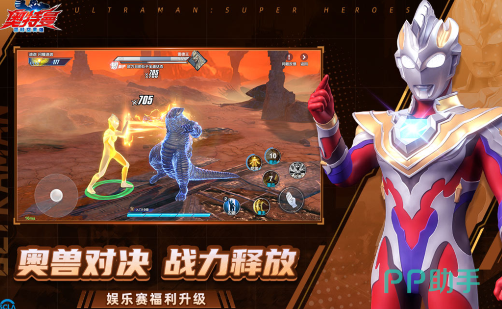欢迎奥特曼粉丝们下载这款动作RPG手游参与冒险,本作继承了奥特曼特摄剧的宇宙观和剧情塑造,扮演奥特曼的你可以自行进入不同地图上参与冒险,打怪兽升级配以强化属性之类的玩法耐玩性更高,奥特曼巨人造型帅气立体给人一种看特摄剧的既视感,每一位奥特曼战士的必杀技也都被一比一复刻。