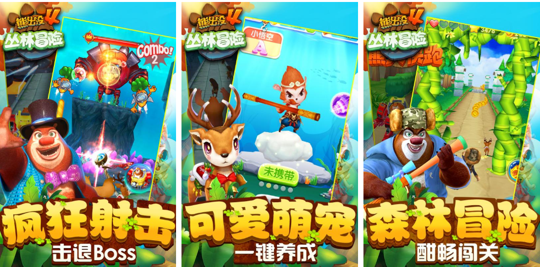延续高速跑酷核心机制,本作强化了关卡策略性与角色成长深度。除基础奔跑跳跃外,新增“机甲形态切换”系统,熊大熊二可随时装备不同功能的丛林机甲模块,如攀岩爪、滑翔翼、震荡锤等,适配地形变化与BOSS战需求。每关设有隐藏支线与限时挑战,通关后可解锁动画片段与角色语音,整体美术风格高度贴合原作设定,色彩明快、细节饱满。