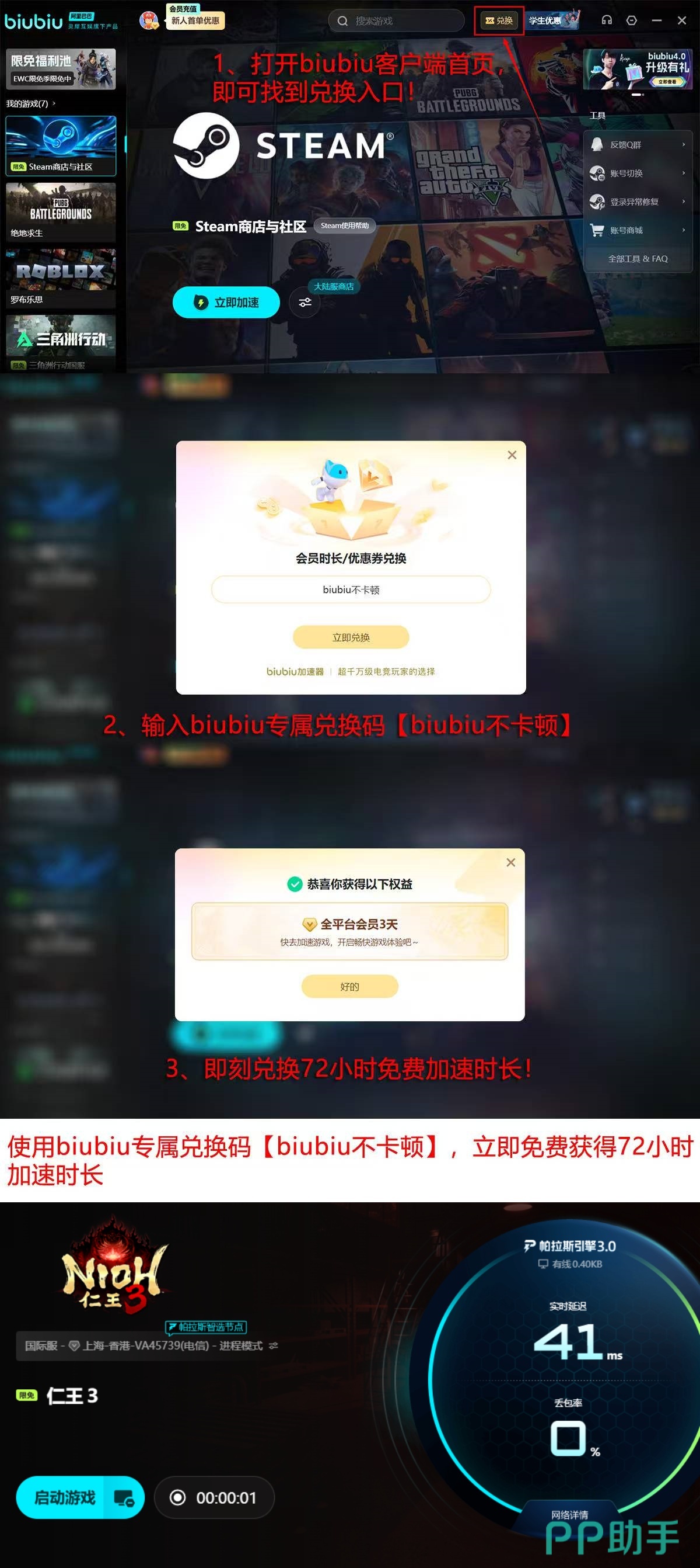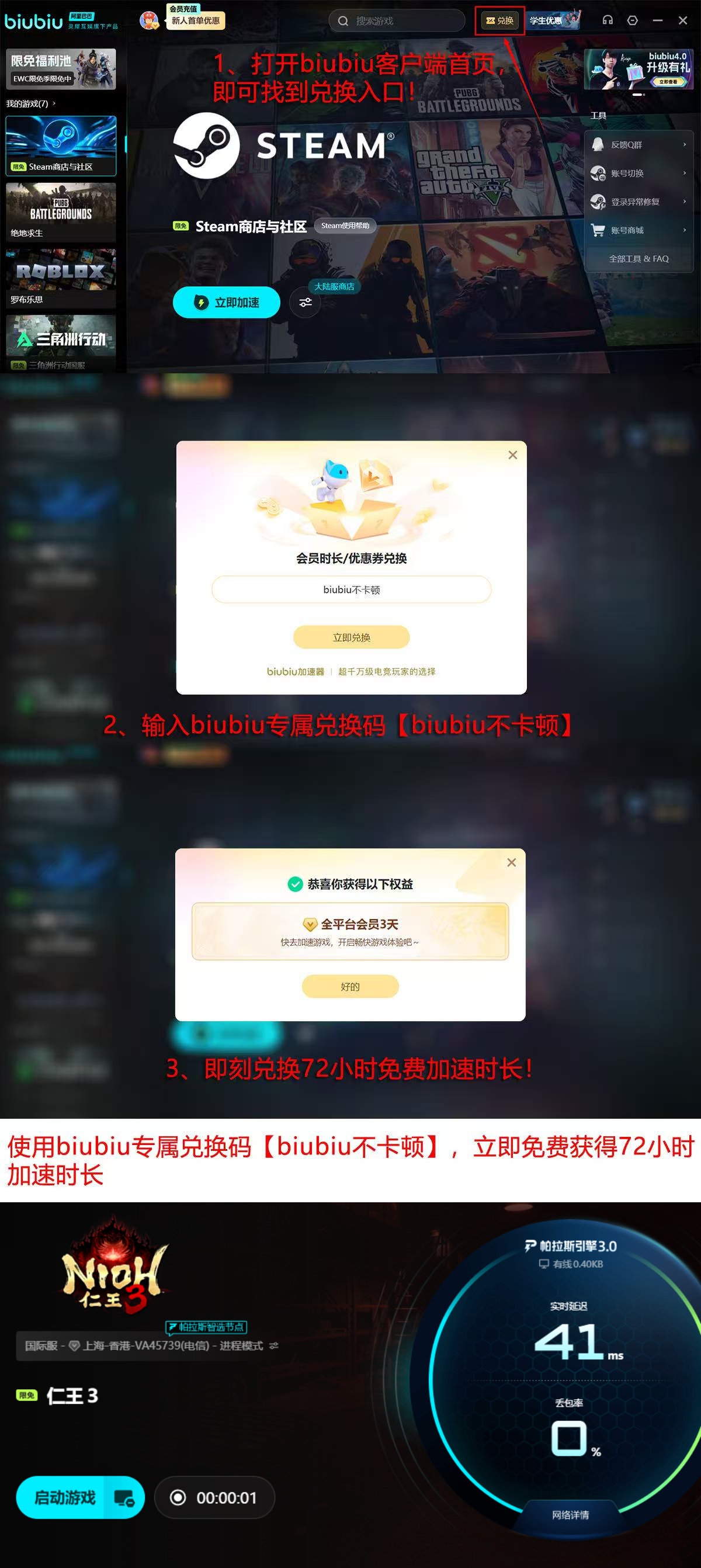 为配合《仁王3》测试阶段用户需求,biubiu加速器特别开放限时免费服务:活动周期为1月29日至2月13日,所有用户均可无门槛使用加速功能。新注册用户额外享有24小时全功能试用权益;输入兑换码【biubiu不卡顿】,还可立即激活72小时连续加速权限,覆盖完整测试期体验。
