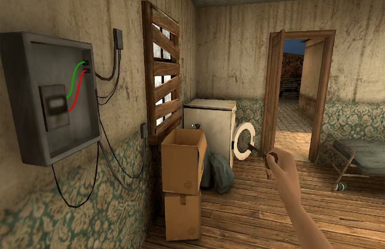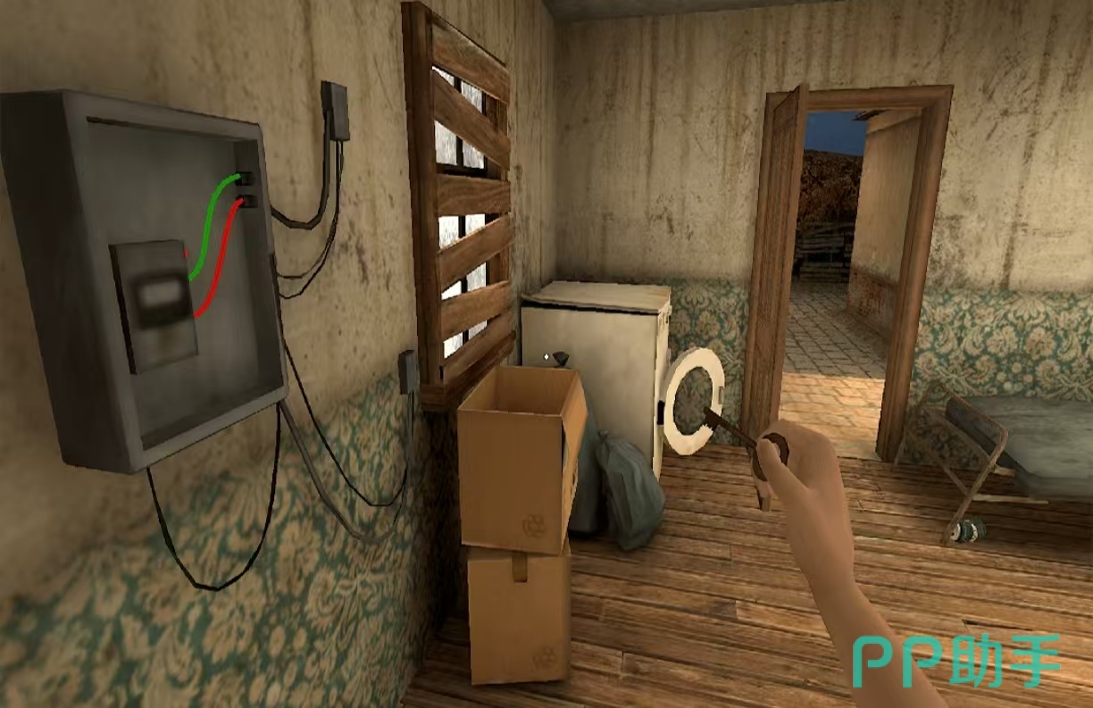 游戏以写实风格还原上世纪老式公寓格局,玩家被困于屠夫居所内部,需在有限视野与听觉反馈中判断其巡逻路径。各房间功能明确——厨房藏有钝器、储藏室可翻找钥匙、阁楼存有旧地图。解谜机制融合物理互动(如拖拽家具制造障碍)、声源误导(敲击管道引开注意)及时间差潜行。BGM采用低频环境音与骤停静默交替设计,强化心理压迫感;主线目标包括营救被囚同伴,全程无直接战斗,纯靠观察与预判破局。