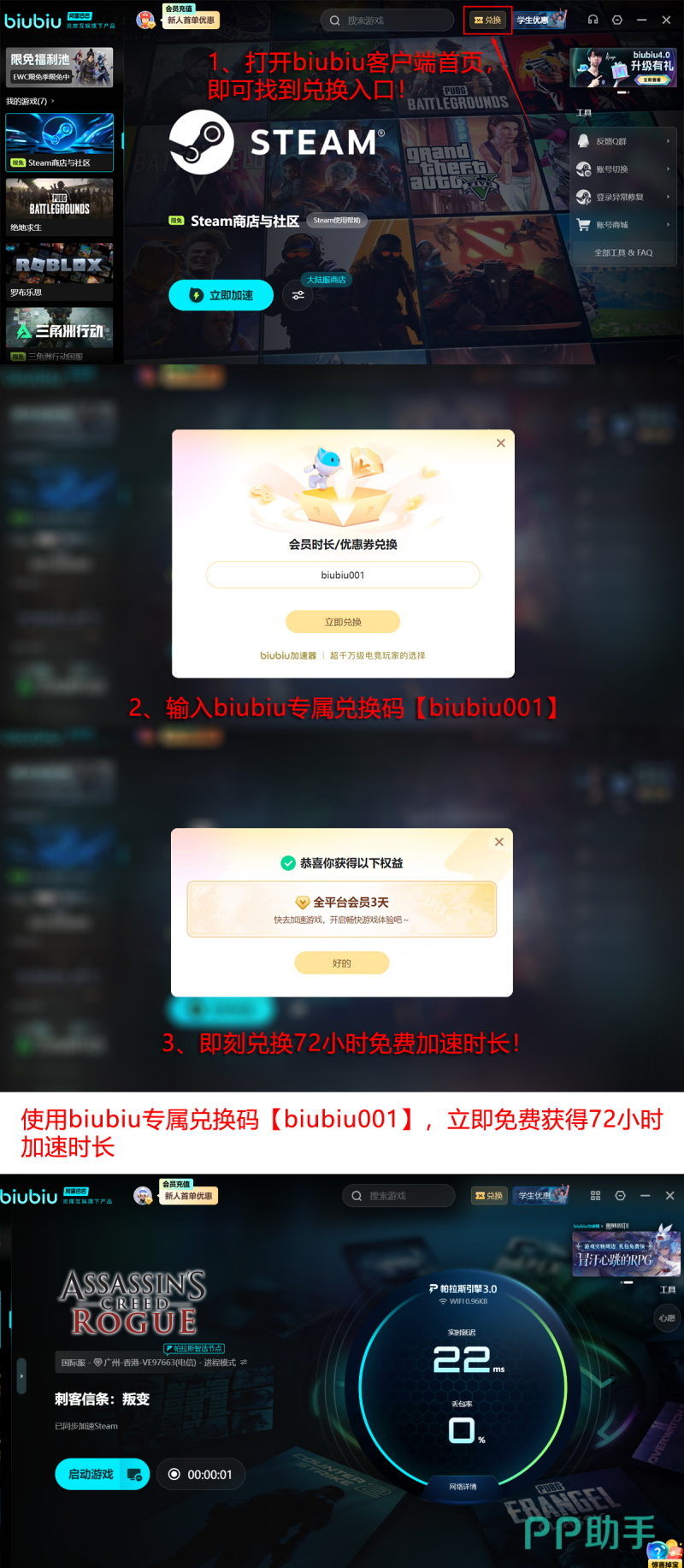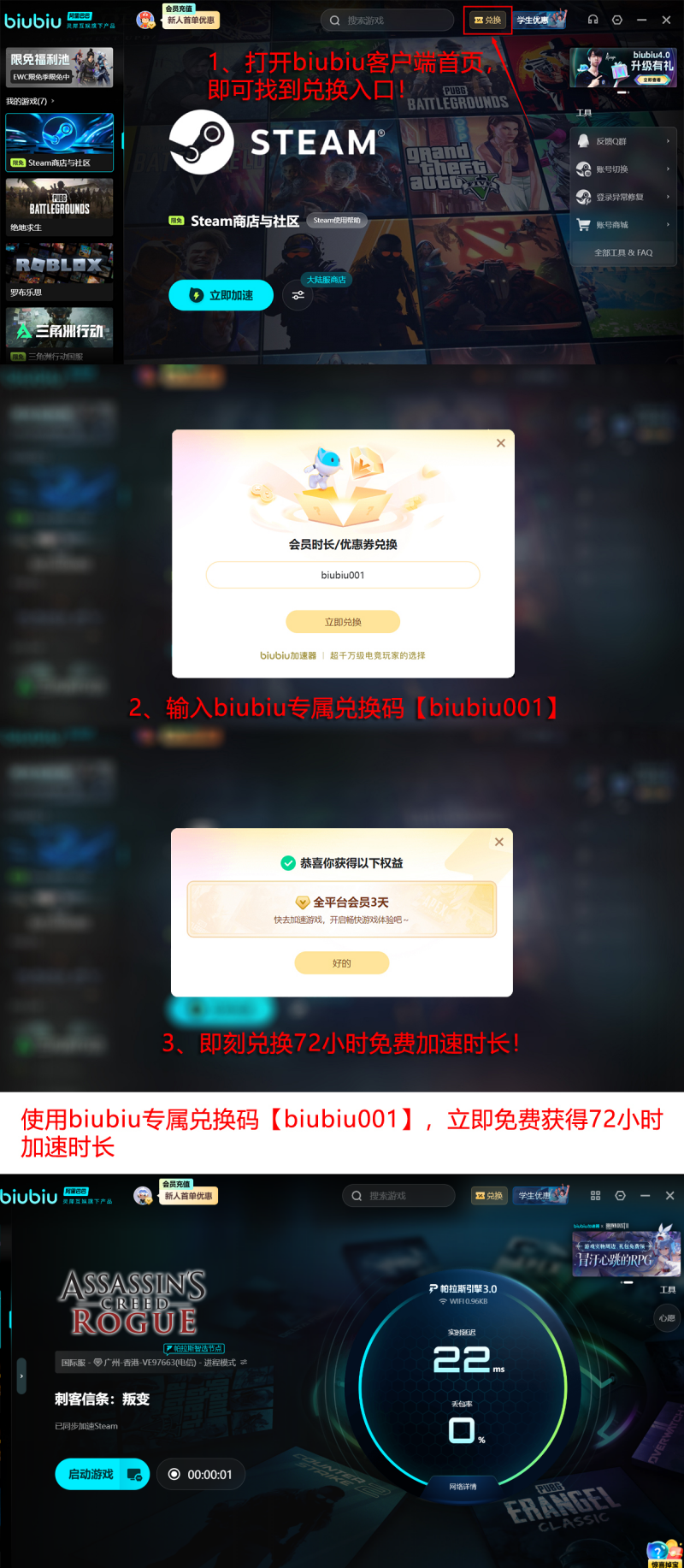 新注册用户可直接领取24小时免费加速时长;输入兑换码【biubiu001】还可额外激活3天权益。两项福利可叠加使用,最高累计达96小时。当前版本全面适配Steam、Uplay及Epic等主流平台客户端,涵盖游戏启动、更新下载、DLC加载全流程加速支持。