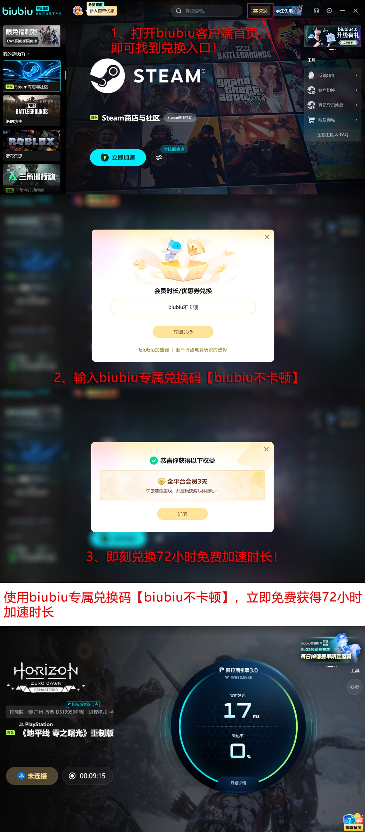 当前新用户注册即可获赠24小时全节点加速权限;所有用户均可凭口令【biubiu不卡顿】兑换额外72小时加速时长。新老用户叠加使用后,总计享有96小时免付费深度体验,无需任何预充值或订阅绑定,即可验证其在高强度联机与复杂场景下的运行可靠性。