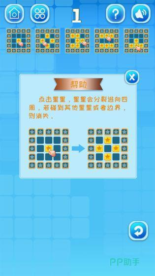 一款轻量级但富有策略性的消除类益智游戏。规则简洁:点击金色星星后,其周围方块按固定逻辑旋转,当所有星星被消除即视为通关。整体美术风格清新明快,UI布局简洁直观;关卡数量充足,且每一关在布局逻辑、旋转规则及连锁判定上均有差异化设计,兼顾新手引导与进阶挑战。
