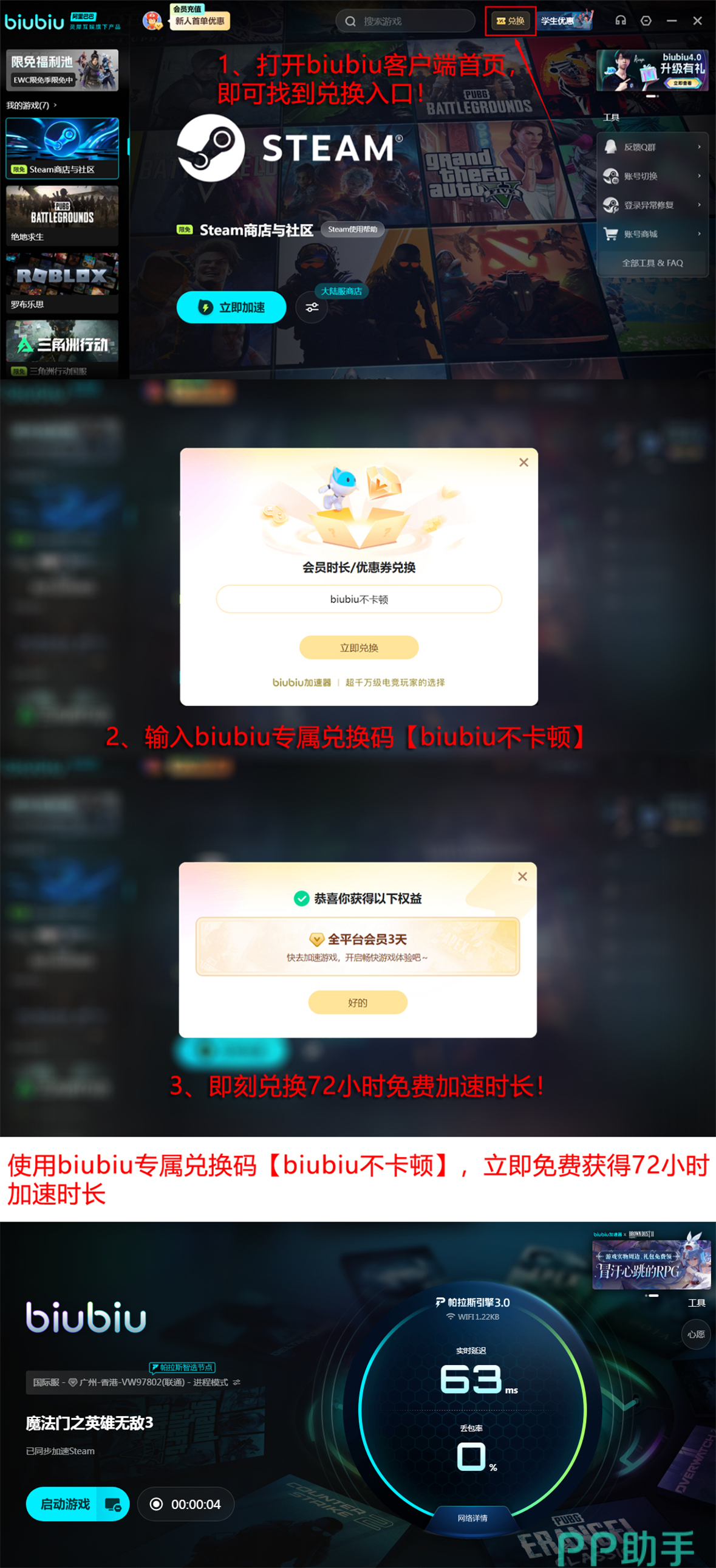 biubiu在福利方面也具有相当强的优势,目前的福利主要有以下两项,第一项是每个号都可以通过兑换码【biubiu不卡顿】得到72小时会员加速时间。第二项是刚注册的新号,能够直接获得24小时会员加速时间。这样新注册账号两项福利都能享受到,总计96小时,绝对可观。在biubiu中还免费提供了海量游戏攻略和资讯内容,打造了一个人气很高的游戏社区,在这里有海量话题可以随时加入进来讨论。通过这些免费内容,能大大加深玩家对游戏的认识。