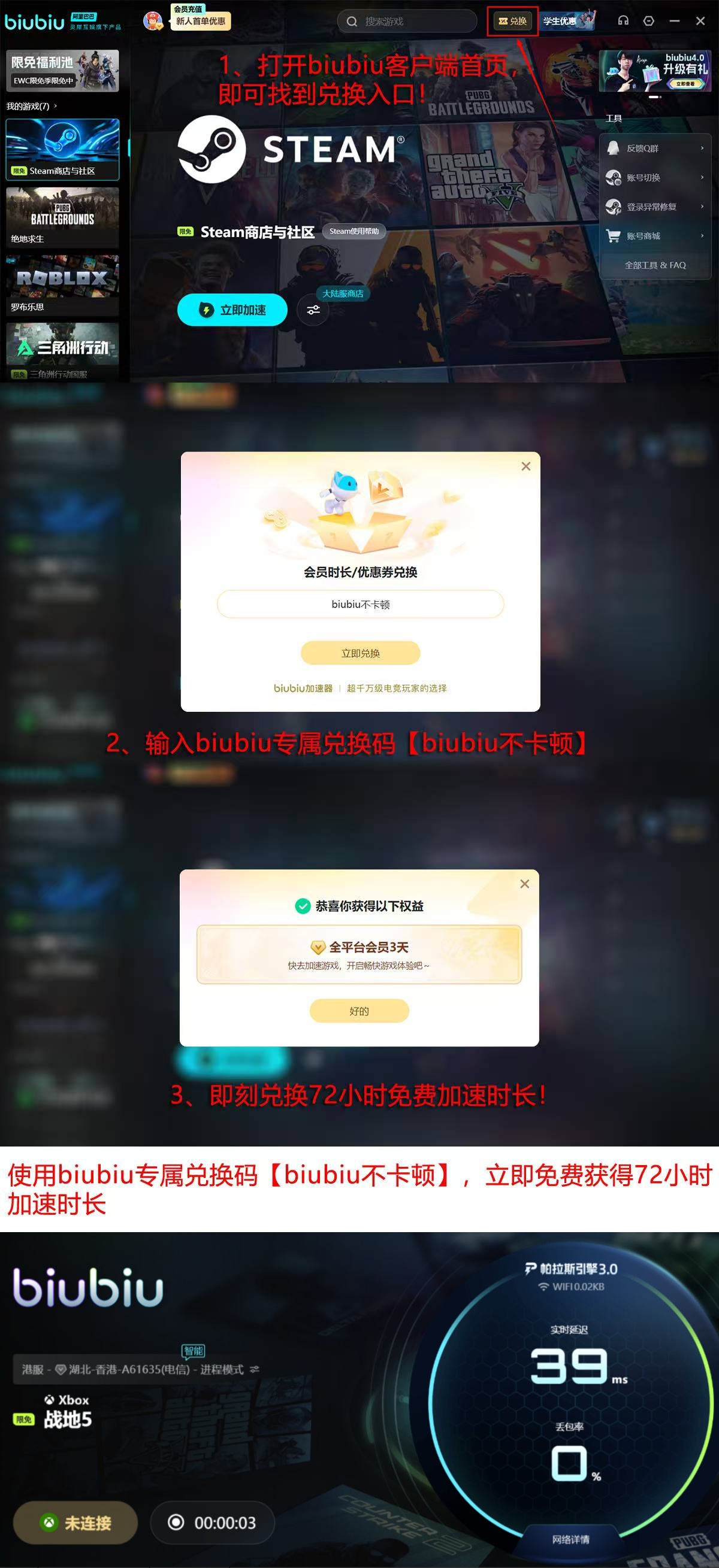 现在为了让广大用户,可以无门槛试用,还推出了两项福利活动,其一是新用户只要进行注册登录,就会直接获得24小时的免费加速时间,另外一个需要大家在登录后,在首页上找到兑换的按键,点击进入并输入【biubiu不卡顿】,这样能再获得免费的72个小时,两项累计一下总共有96小时。