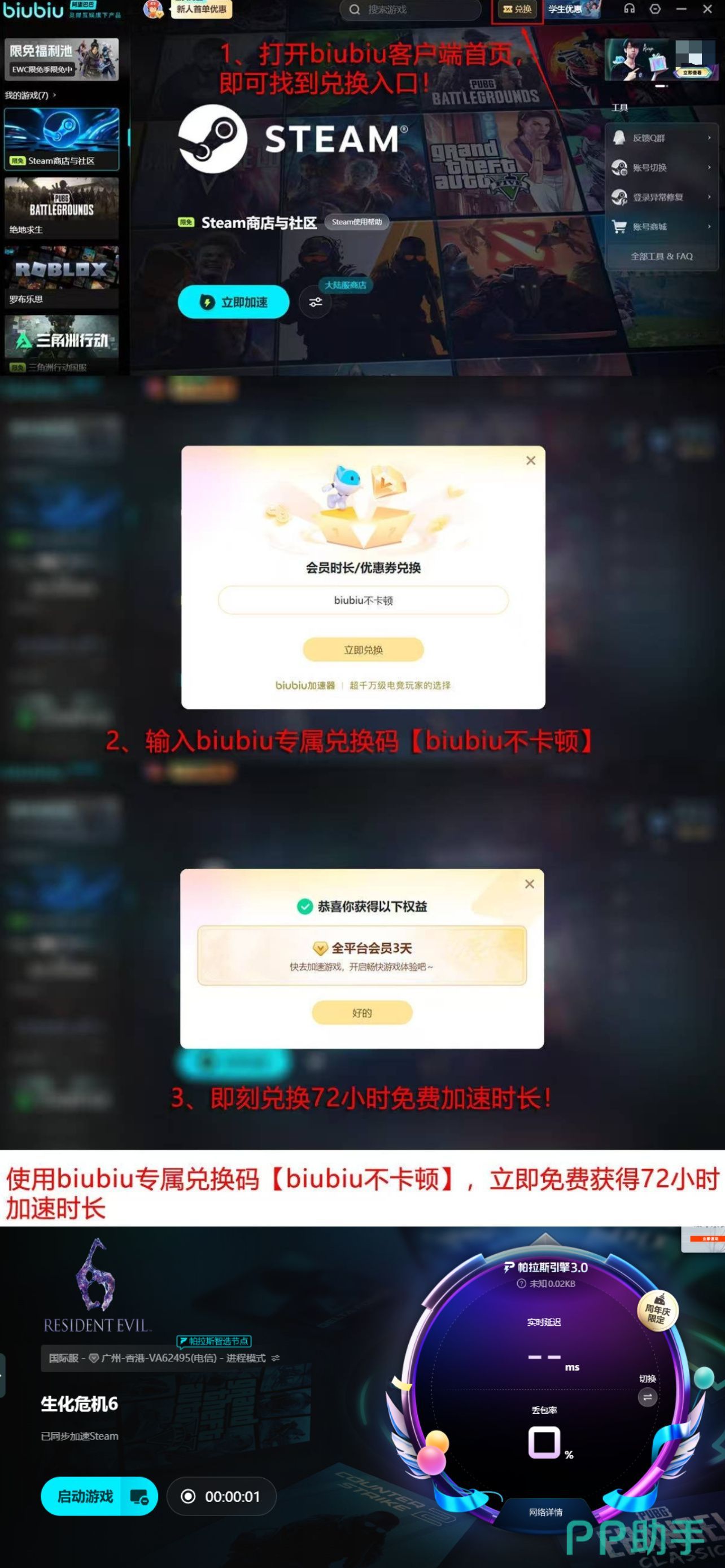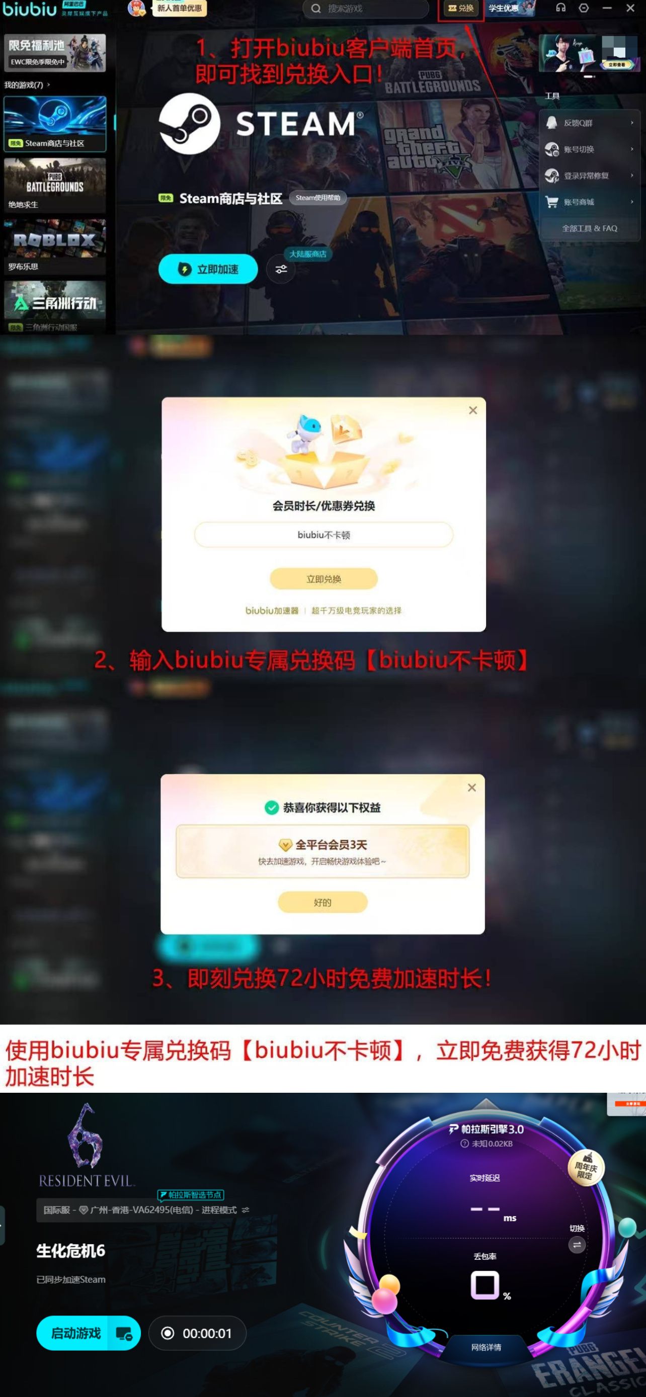 即日起新用户注册biubiu加速器,即可立即启用首日全功能试用权限(24小时),输入激活码【biubiu不卡顿】可额外获得72小时深度体验资格,新用户累计享有96小时无限制加速服务,全面缓解《生化危机6》运行过程中的闪退、掉线与加载异常等问题。