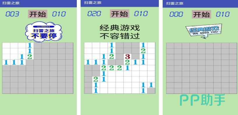 《扫雷之旅》与电脑扫雷玩法完全一致,玩家可以通过翻格子的方式来确定周围的地雷数量,其核心玩法就是分开所有安全格,并标记全部地雷。有初级、中级和高级等多个难度级别,提供了除了方块以外的矩形和心形等多种布局,玩家可以在不同的布局中逐一的点开方格,查看地雷的位置。这种简洁而不失挑战性的玩法,也能够让玩家锻炼自己的心理承受能力。