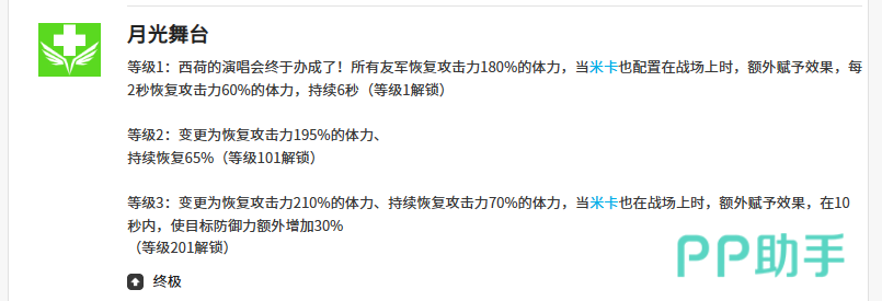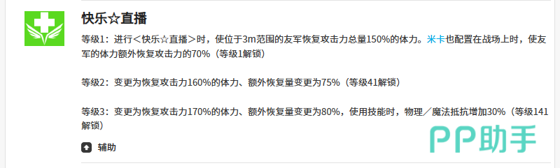 三技能“快乐的直播”同样覆盖3米范围,提供150%攻击力的生命恢复。在米卡协同条件下,该技能可额外提升70%攻击力对应的生命值回复量,使单次群体治疗总量明显高于一技能,成为中后期团战关键续航手段。但该强化效果严格依赖米卡在场,不具备独立生效条件。