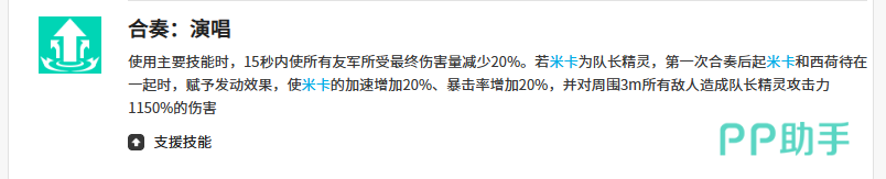 西荷的支援技能具备三重战略价值:一是为全体友军提供15秒内20%减伤;二是若由米卡担任队长精灵,则额外赋予西荷20%加速与20%暴击率提升;三是使西荷对周围3米内所有敌人造成1150%攻击力的高额伤害。可见,米卡不仅是西荷技能强化的必要条件,更是其从功能型辅助跃升为战术核心的关键支点。