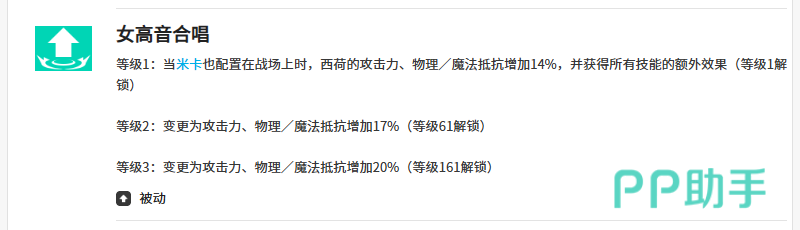 四技能“女高音合唱”进一步强化双人组合的战略价值:米卡在场时,西荷获得全类型抗性(物理+魔法)各14%的固定提升,该增益直接作用于西荷自身属性面板,且可与其他增益叠加,有效增强其战场生存能力与技能释放稳定性。