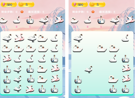以天鹅主题为视觉核心的三消益智游戏。玩家通过滑动连接相同形态或颜色的天鹅图标完成消除,每关设定固定步数上限与目标分数。背景采用柔和水彩风格,配合流畅动画表现天鹅展翅、游弋等动态细节,营造沉浸式美学体验,兼具解压性与挑战性。