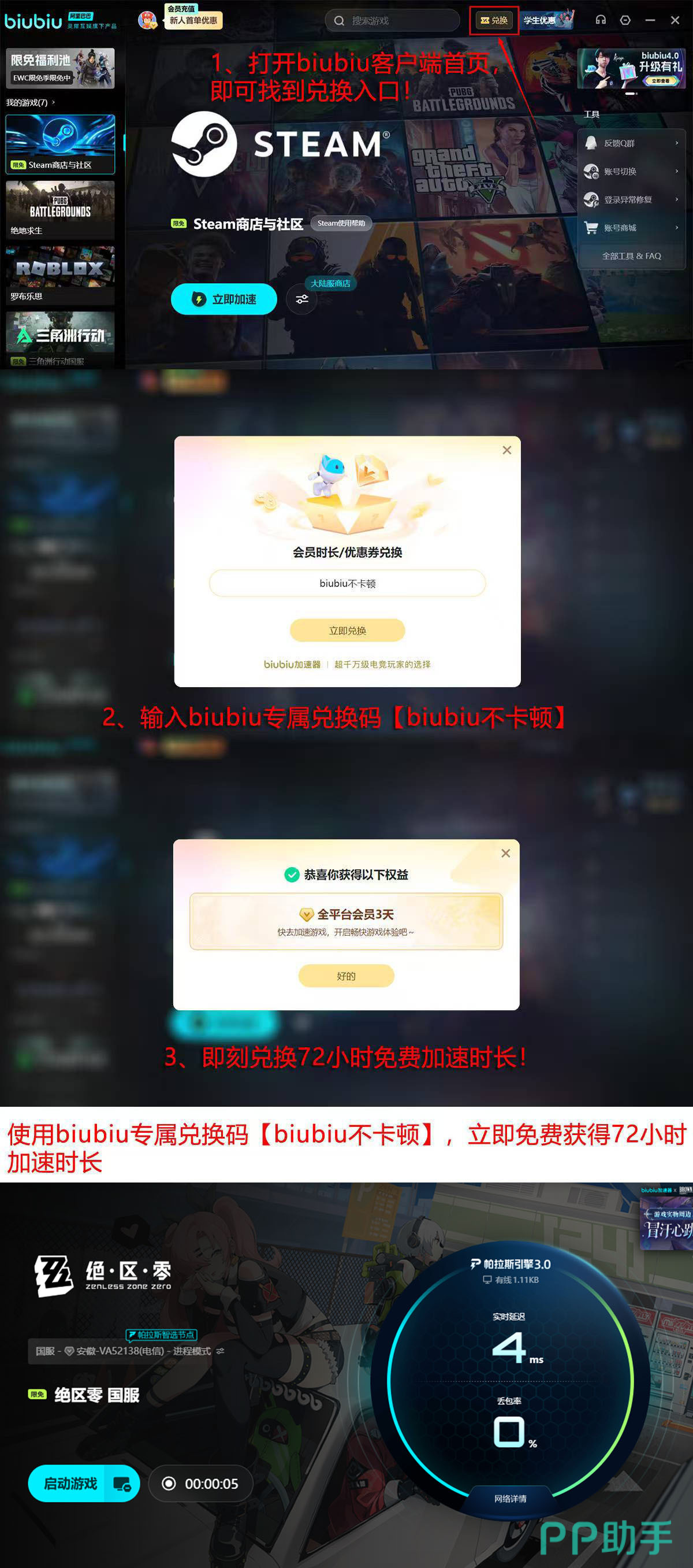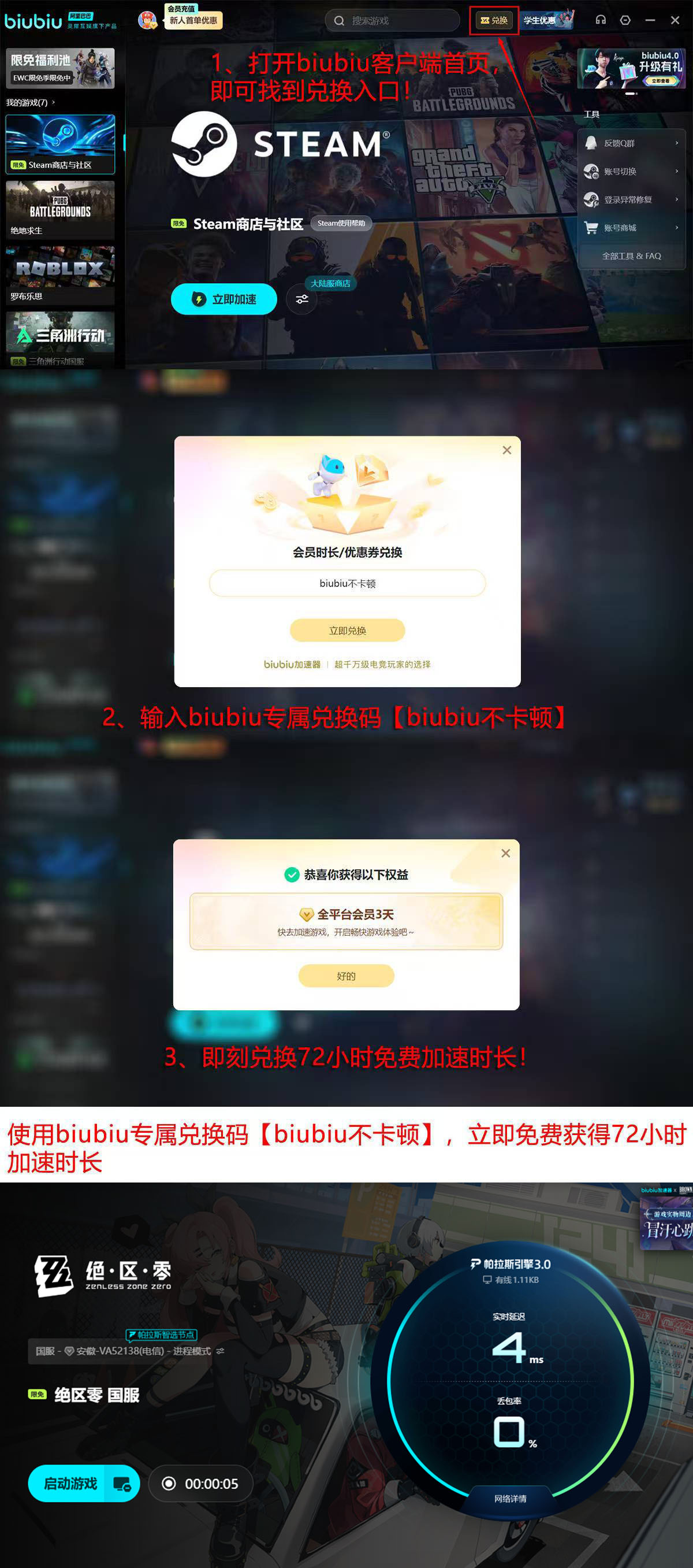 实测数据显示,启用biubiu加速器后,《绝区零》平均帧率波动降低约68%,高负载场景下闪退率趋近于零。现面向新用户开放限时体验:完成注册即可获赠24小时免费使用时长;另可通过首页“兑换”入口,输入口令【biubiu不卡顿】,额外领取72小时权益,总计可享96小时无限制加速服务。