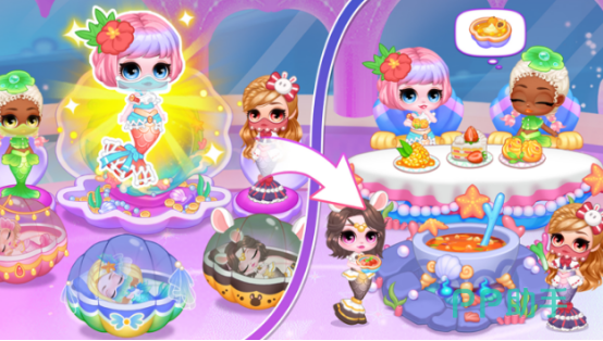 采用Q版卡通画风构建海底奇幻世界,主角为多位萌系美人鱼公主。游戏融合角色养成、场景装饰与轻度小游戏玩法,支持自定义公主外观、布置海底城堡及探索隐藏区域。美术风格清新细腻,场景细节丰富,如珊瑚迷宫、发光水母群落、水晶洞穴等,营造沉浸式视觉体验。