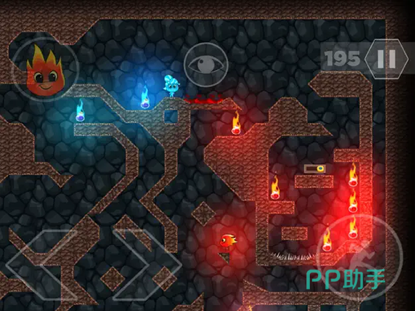 冰人和火人将会一同出现在关卡中进行冒险,关卡中的场景充满的复古的感觉,通过对角色的控制可以获得钻石或者是其他的道具奖励。森林关卡中的每一次前行都需要两个人的完美配合,通过精准的操作和仔细的观察,通过所有的障碍。当两个角色各站在一端的吊梯上一名角色进行跳跃时,另一名角色也要开启相应的操作动作,确保着两人同时向前移动。