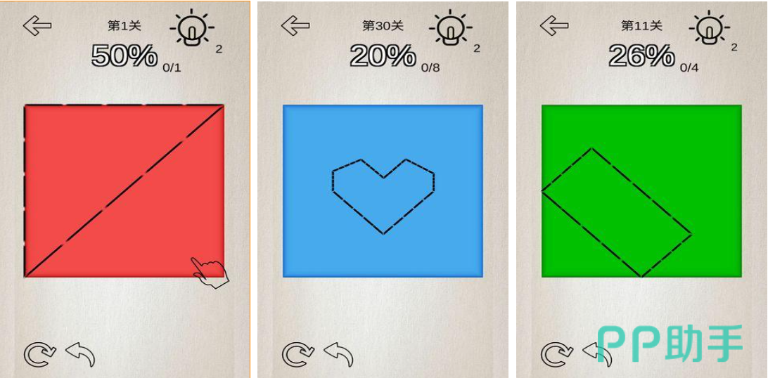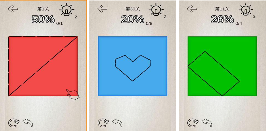 以折纸几何原理为核心机制的硬核解谜作品。每关提供一张初始正方形纸,目标为通过有限次数的折叠达成指定二维轮廓。系统实时显示当前还原度百分比,并支持回溯任意步骤。色彩分层纸张材质增强视觉辨识度,折叠线角度精度达0.1度级,对空间感知与微操稳定性提出明确要求。