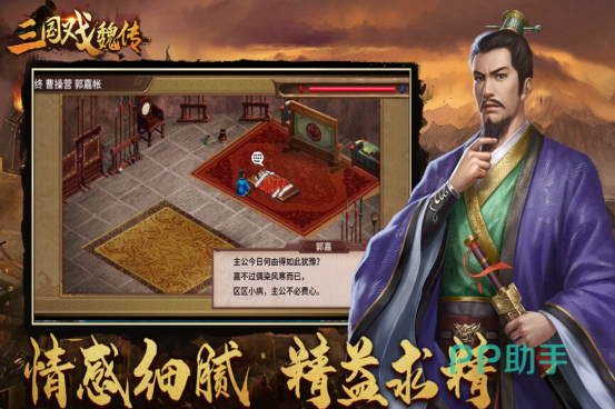 聚焦曹魏势力视角展开的三国战棋叙事。时间线从黄巾起义始,贯穿官渡、赤壁至五丈原等标志性战役。每场战斗前可自由编组最多6名武将,根据城池高低、河流走向、树林遮蔽等三维地形要素调整站位与技能释放路径,策略维度覆盖宏观行军与微观走位。