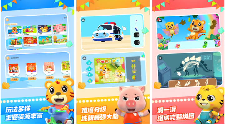 专为锻炼视觉辨识与空间推理能力设计,涵盖动物、交通工具、四季等十余类主题拼图。难度梯度明确,从3片至24片逐步进阶,适配不同发展水平儿童。触控拖拽反馈灵敏,完成组合后自动触发正向提示,强化成就感与复盘意识。图像构图简洁、色彩对比鲜明,有助于提升注意力稳定性与手眼协调性。