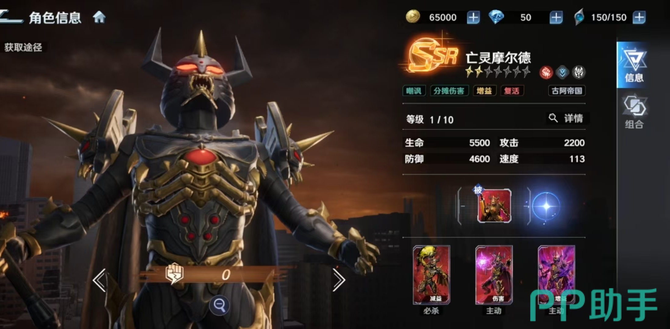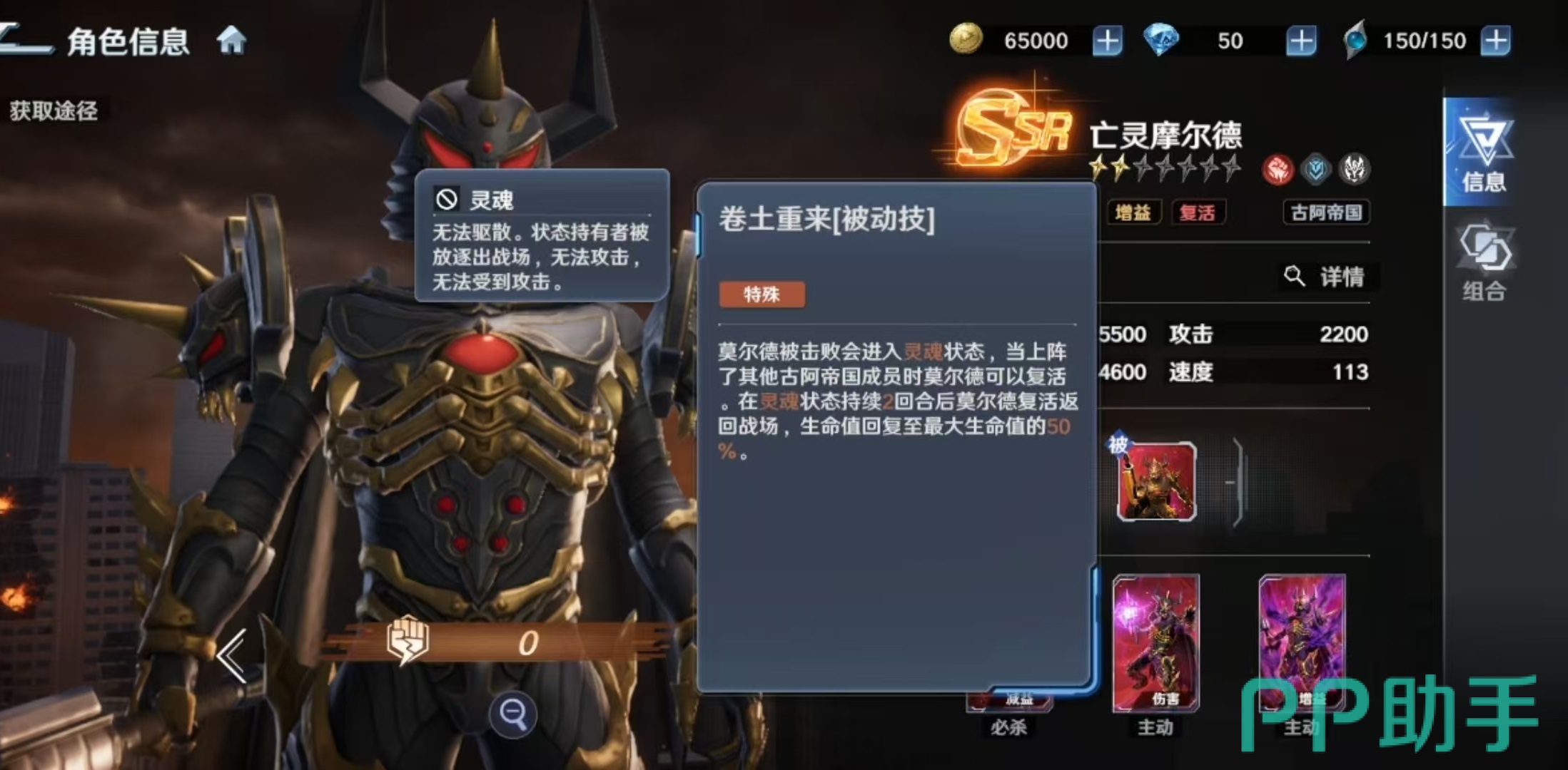 亡灵摩尔德为古阿帝国阵营专属角色,具备三重战略功能:群体嘲讽控制、伤害分摊承接、以及条件型战场复活。其被动技“卷土重来”设定为——当自身被击倒时,若当前场上至少存在1名其他古阿帝国阵营友方单位,则可在2回合后自动返场,并恢复至50%最大生命值。该机制显著延长了其持续作战周期,但需注意:阵容中必须配置至少1名同阵营角色方可触发复活效果。