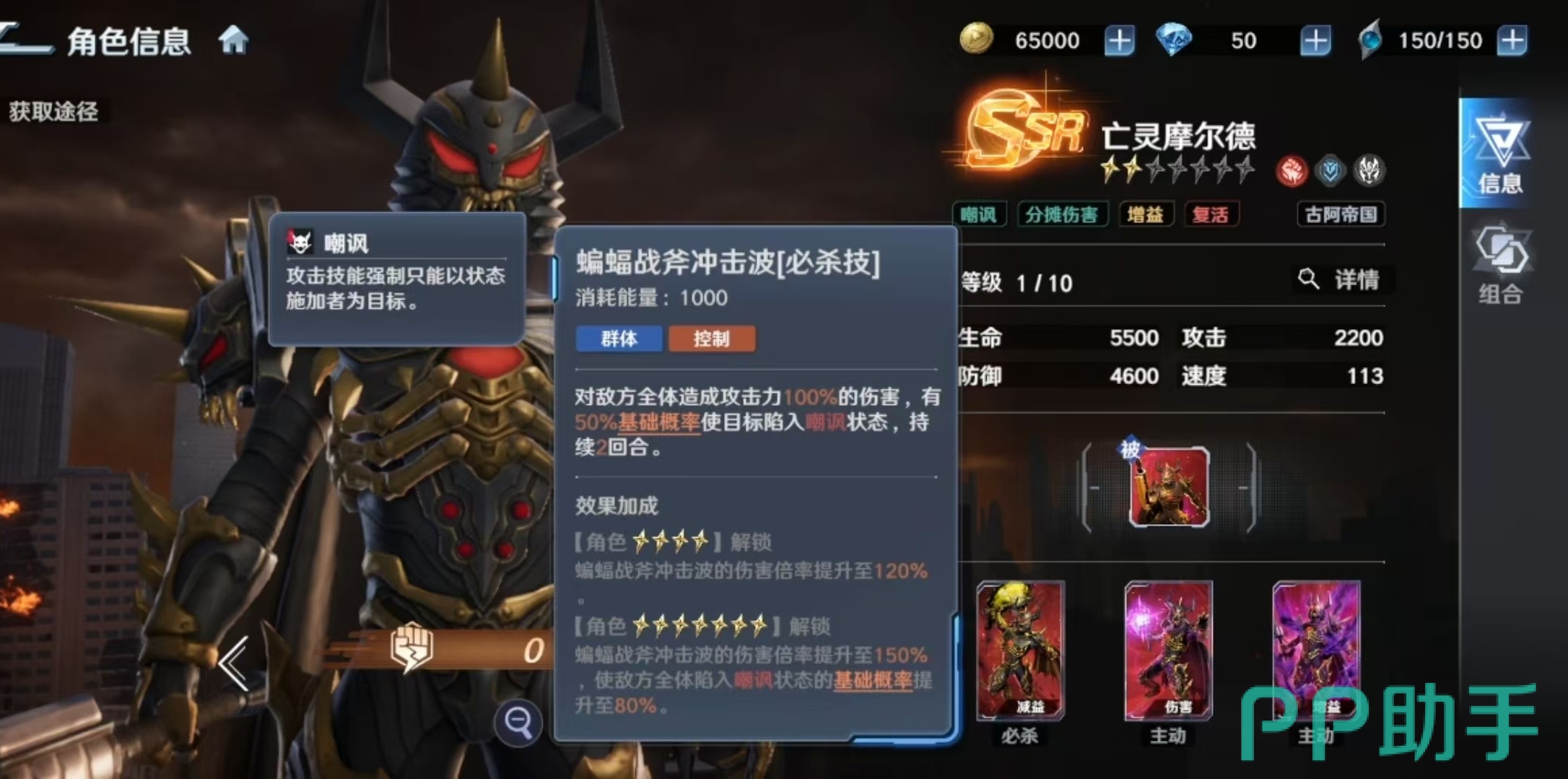 主动技能方面,“蝙蝠战斧冲击波”为全体攻击技,基础伤害可观,并附带概率型嘲讽效果(持续2回合),被嘲讽目标强制以施放者为唯一攻击目标,形成天然保护屏障;随星级提升,该技能伤害倍率与嘲讽触发概率同步增强。单体技“念力飞斧”可对指定敌人实施多段打击,附加额外伤害。辅助技“暗黑恩赐”则为我方全体提供防御增益,若受加持者同属古阿帝国阵营,还将额外激活“链接”状态——该状态下,链接单位所受部分伤害将转移至亡灵摩尔德承担,进一步强化团队生存韧性。