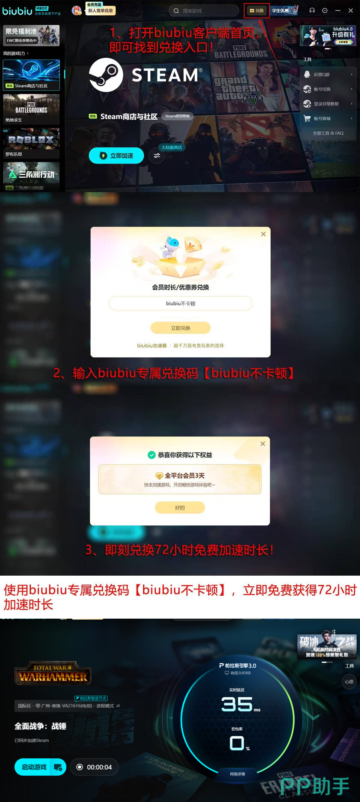 新注册用户可直接获取24小时全功能试用权限;输入激活码【biubiu不卡顿】,即可额外延长战锤战役体验时长至72小时;两项权益叠加后,总计享有96小时无限制加速服务,充分验证产品在复杂战术场景下的稳定性表现。