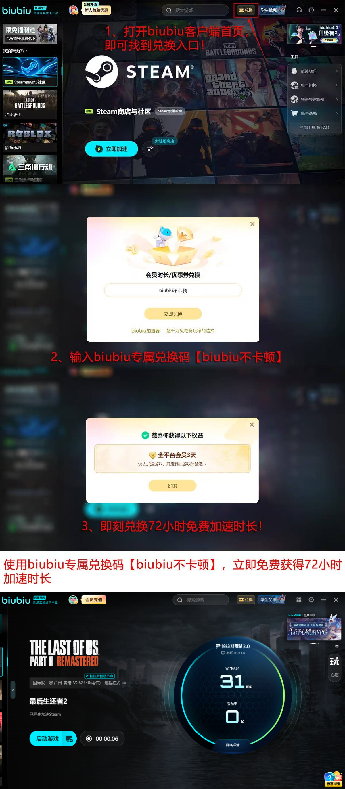 面向首次使用用户,biubiu加速器提供无门槛试用权益:完成账号注册即可激活首日24小时全功能加速服务;输入专属口令【biubiu不卡顿】,额外解锁连续72小时《最后生还者2》专项加速权限,累计可享96小时免费体验周期,全程享受毫秒级响应与金融级链路保障。