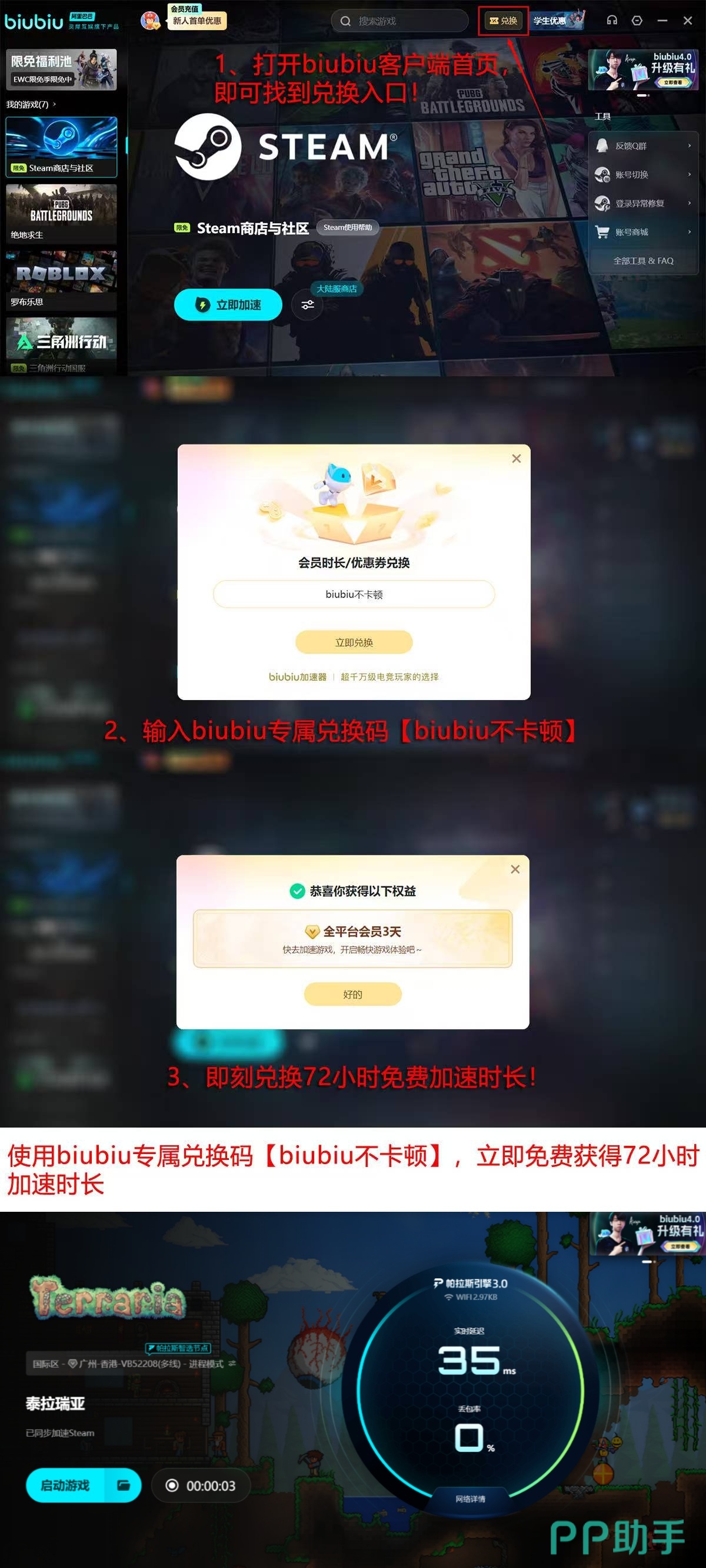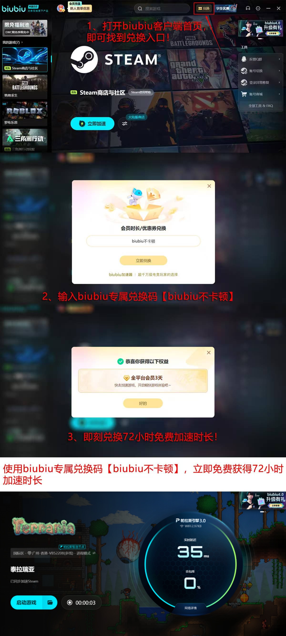 当前新用户注册即可领取24小时全游戏加速时长;完成首次登录后,输入专属口令【biubiu不卡顿】,还可额外获赠72小时加速权益,总计享受96小时无限制网络优化服务。