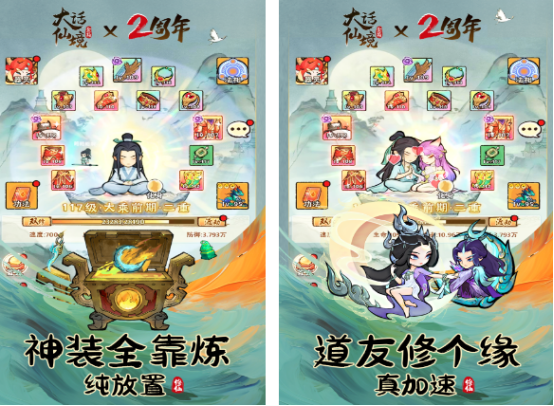 主打轻度修仙体验的放置类手游,围绕“练气—筑基—金丹—元婴”四大修行阶段展开成长主线。玩家以宗门新晋弟子身份起步,通过自动挂机获取资源,手动操作完成炼器、开箱、炼丹、布阵等关键行为。整体界面采用水墨晕染技法,配合留白构图与篆体UI字体,营造静谧悠远的东方美学氛围,适配碎片化时间投入需求。