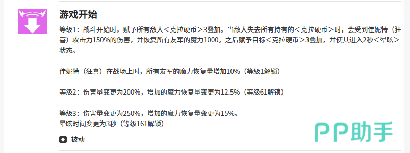 被动技【游戏开始时】提供开局压制与团队续航:战斗初始即强化敌方【克拉硬币】的叠加效率;若敌方失去该状态,则立即承受佳妮特150%攻击力的真实伤害,并为全体友军恢复1000点魔力;进入后期阶段后,该被动还可附加2秒群体眩晕控制,大幅提升团战先手优势。