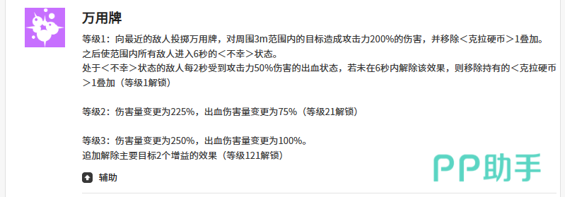 二技能【万用牌】具备精准打击与群体压制双重特性:向最近敌人投掷卡牌,对半径3米内所有目标造成200%攻击力的伤害;若目标已叠加【克拉硬币】,则使其陷入【不幸】状态——该状态每2秒造成佳妮特攻击力50%的持续伤害,并有概率触发【出血】效果;若出血未在6秒内清除,将直接移除一层【克拉硬币】叠加,形成敌方状态反制链。