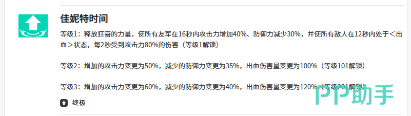 终极技能【狂喜的力量】兼具攻防强化与持续压制:开启后,全体友军获得持续16秒的40%攻击与防御提升;同时,所有敌人强制进入持续12秒的【出血】状态,每2秒承受佳妮特80%攻击力的伤害。此外,当佳妮特担任队长精灵时,全队魔力回复效率提升30%,大幅优化技能循环节奏,使高频状态覆盖成为可能。