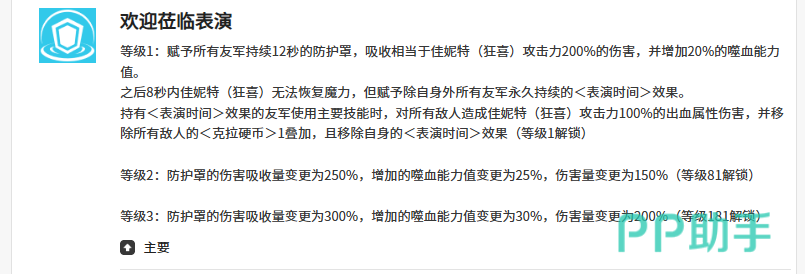 一技能【欢迎莅临表演】为范围型团队防护技:开启后为全体友方单位施加持续12秒的护盾,吸收量等同于佳妮特攻击力的200%;同时赋予自身“嗜血”属性提升,并在后续8秒内,使所有友军获得【表演时间】状态——该状态永久存在,且当携带者释放主动技能时,可对目标造成等同于自身攻击力100%的额外伤害,并基于出血属性进一步强化伤害。值得注意的是,若目标已拥有【克拉硬币】状态,佳妮特可主动解除自身【表演时间】以刷新技能节奏,实现状态管理的主动权。