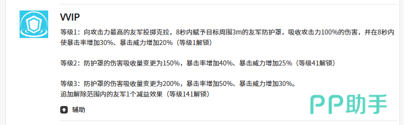 三技能【VVIP】是定向防护核心技:选定我方攻击力最高的单位,为其及周围3米内所有队友施加持续8秒的护盾,吸收量为佳妮特攻击力的100%;若触发暴击,则护盾强度额外提升20%。该技能生效范围与站位密切相关,建议佳妮特保持中前排位置,确保覆盖全队关键输出单位。